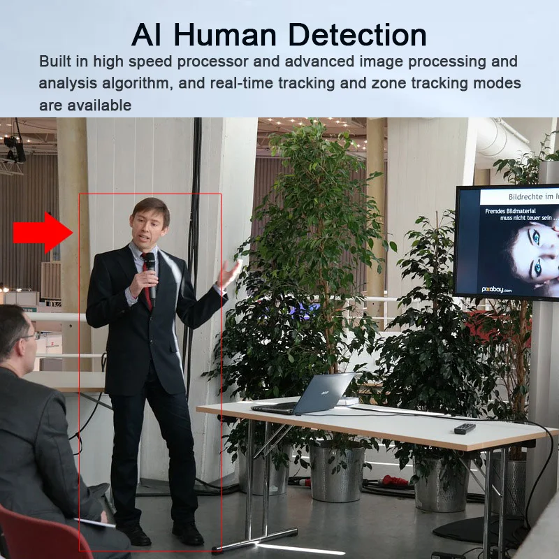Con l’aiuto della potenza di elaborazione AI del chip, la fotocamera è dotata di algoritmi AI avanzati per realizzare il tracciamento umanoide monoculare, che può realizzare il tracciamento automatico di scene come istruzione, conferenze e trasmissioni dal vivo.