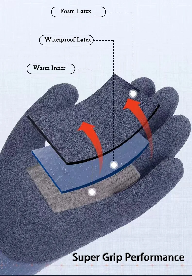 Questi guanti protettivi realizzati in poliestere ad alta elasticità con lattice impermeabile coprono le dita e il palmo, che è impermeabile e antiscivolo.