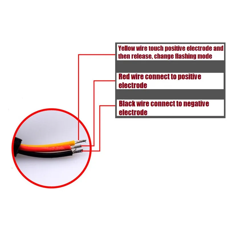 ●Collegamento a 3 fili, Nero per negativo, Rosso per connessione positiva e Gialla Modalità lampeggiante a cambio positivo.
