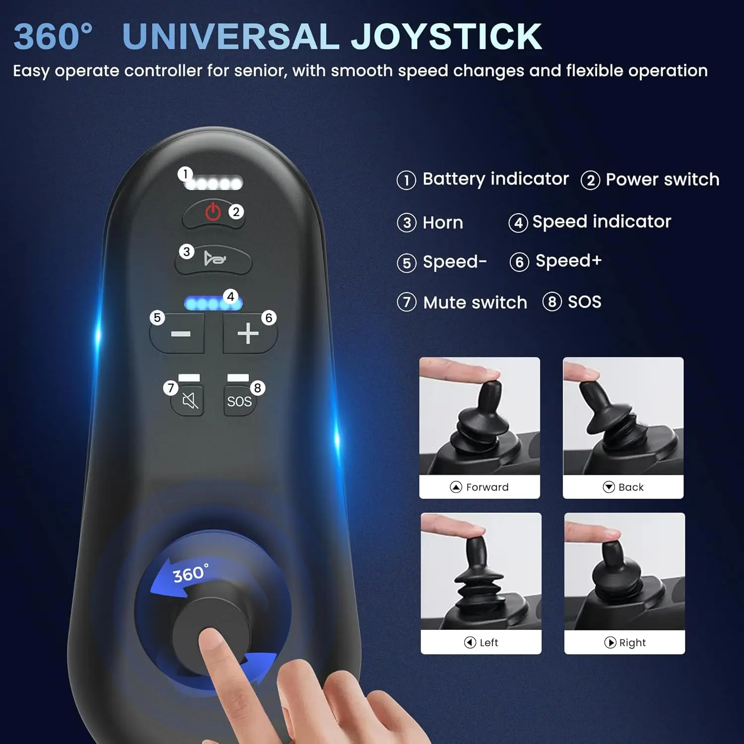 【360° Controllo tramite joystick: progettato pensando agli anziani, un 360 reattivo° Joystick che offre flessibilità e regolazione precisa anche in spazi ristretti.La sedia a rotelle elettrica garantisce una frenata immediata e transizioni direzionali fluide.