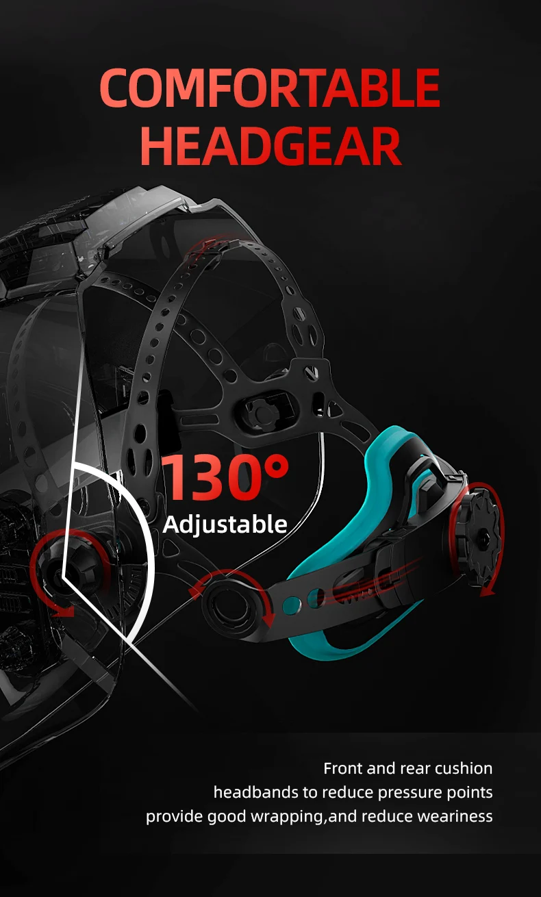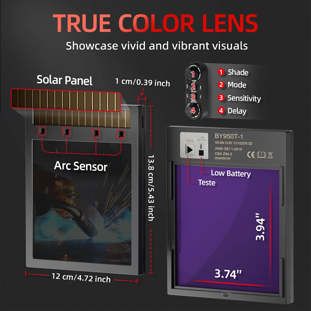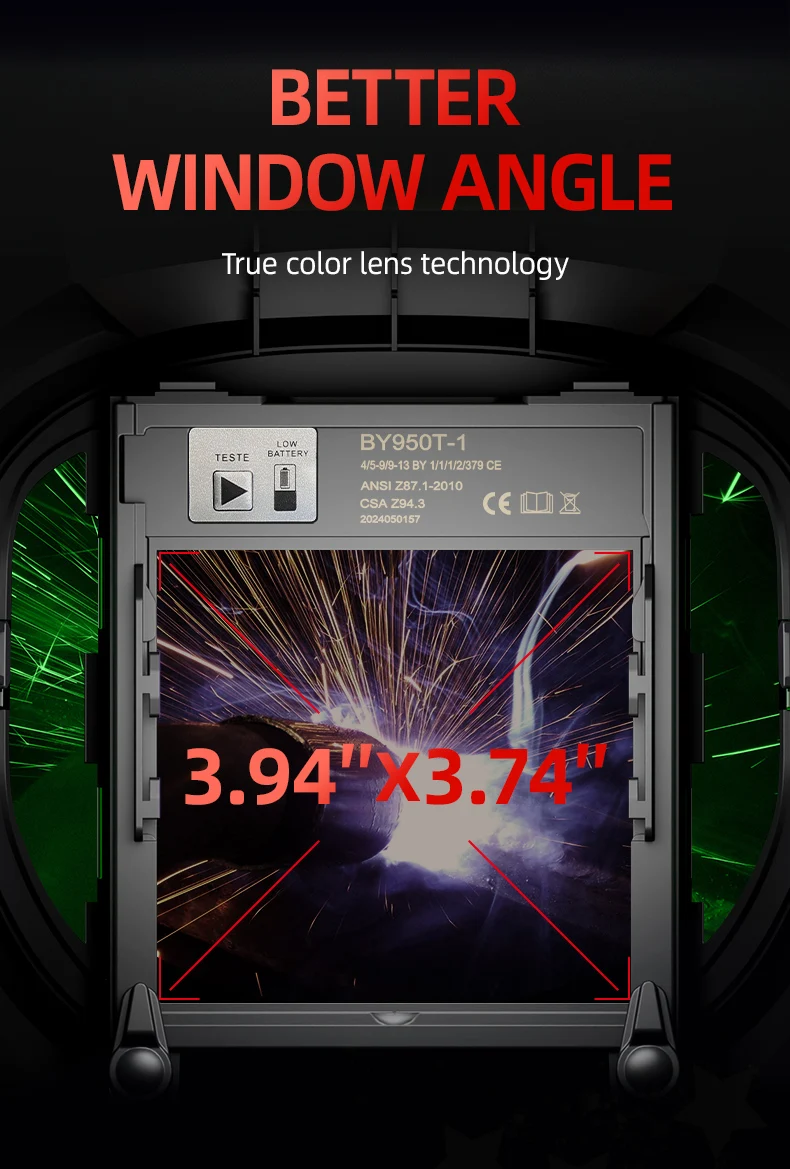 1.180° Ampio schermo di visualizzazione: goditi un’ampia area di visualizzazione di 3,94×3,74 pollici, con ulteriore vista laterale da 3,72×1,76 pollici (DIN4, non oscuramento automatico).Migliora la precisione e il controllo della saldatura con un campo visivo completo attorno all’area di saldatura.