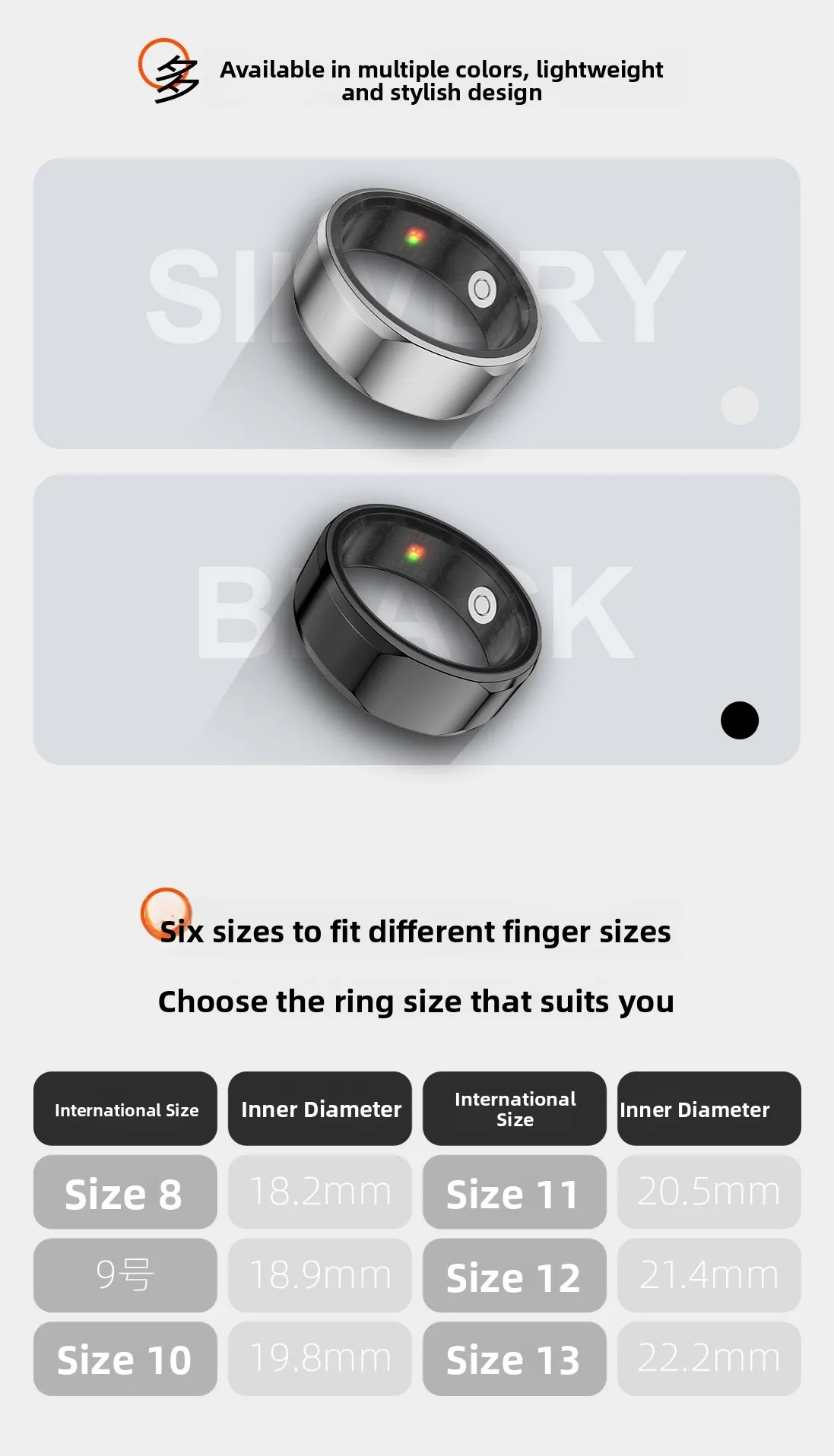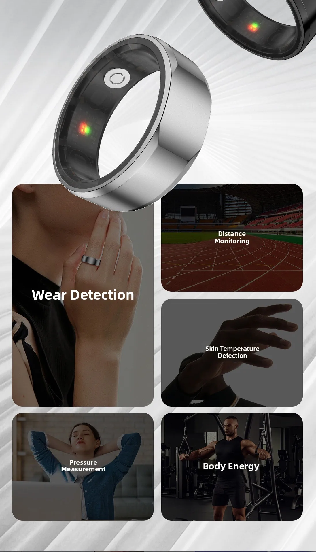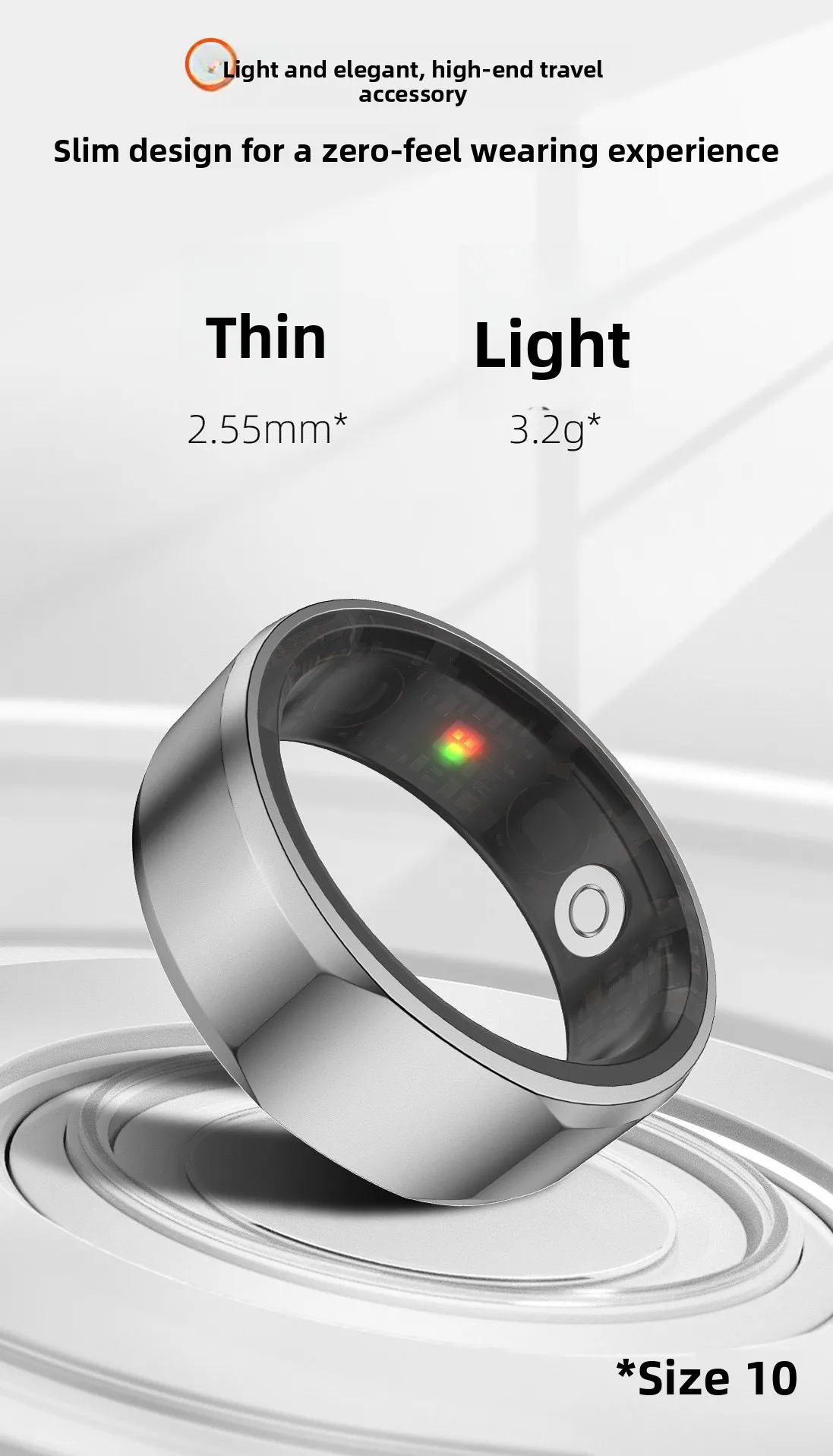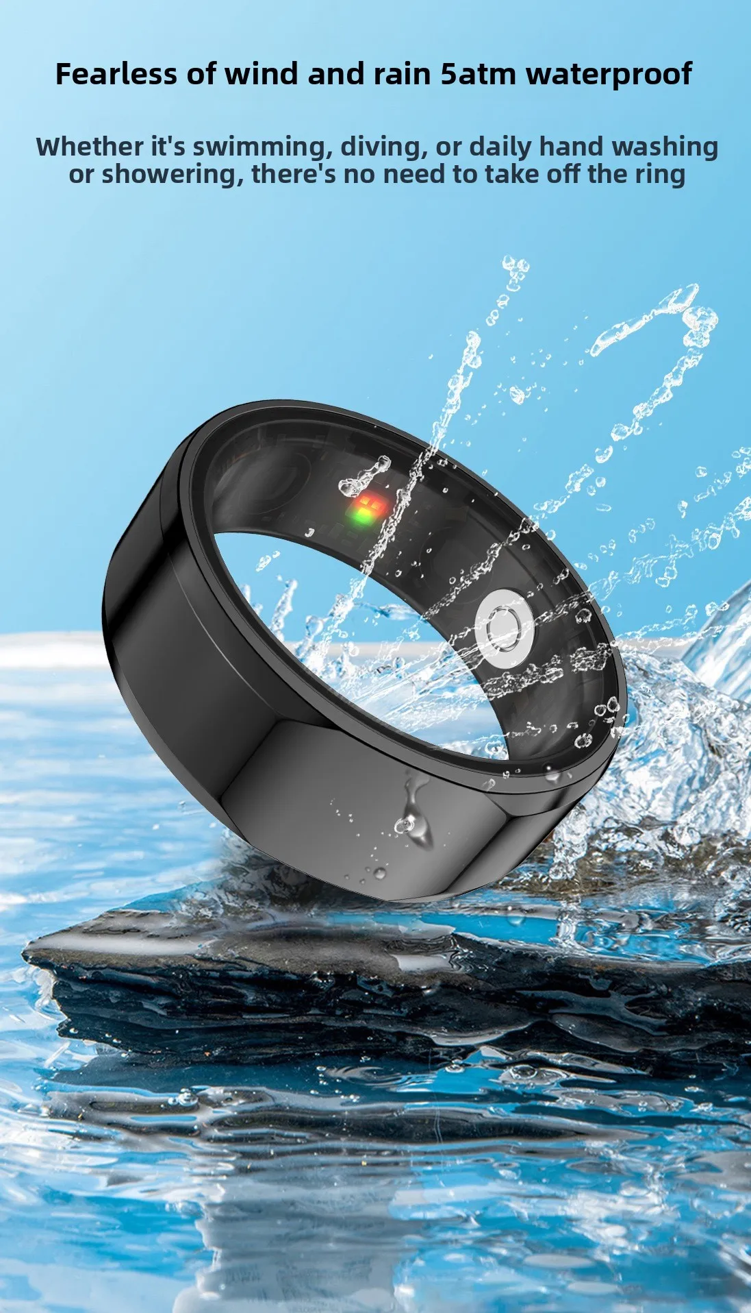 Con un grado di resistenza all’acqua di 5 ATM, questo anello intelligente è adatto per il nuoto e altre attività acquatiche.