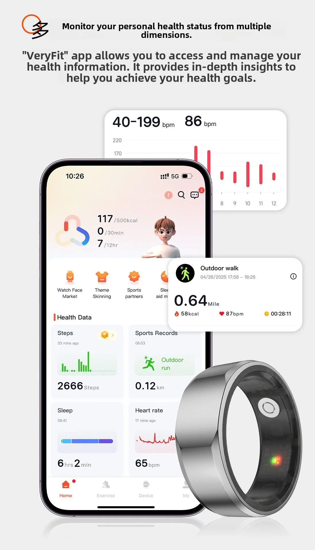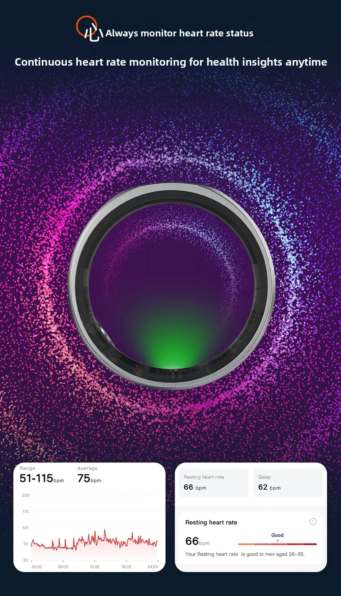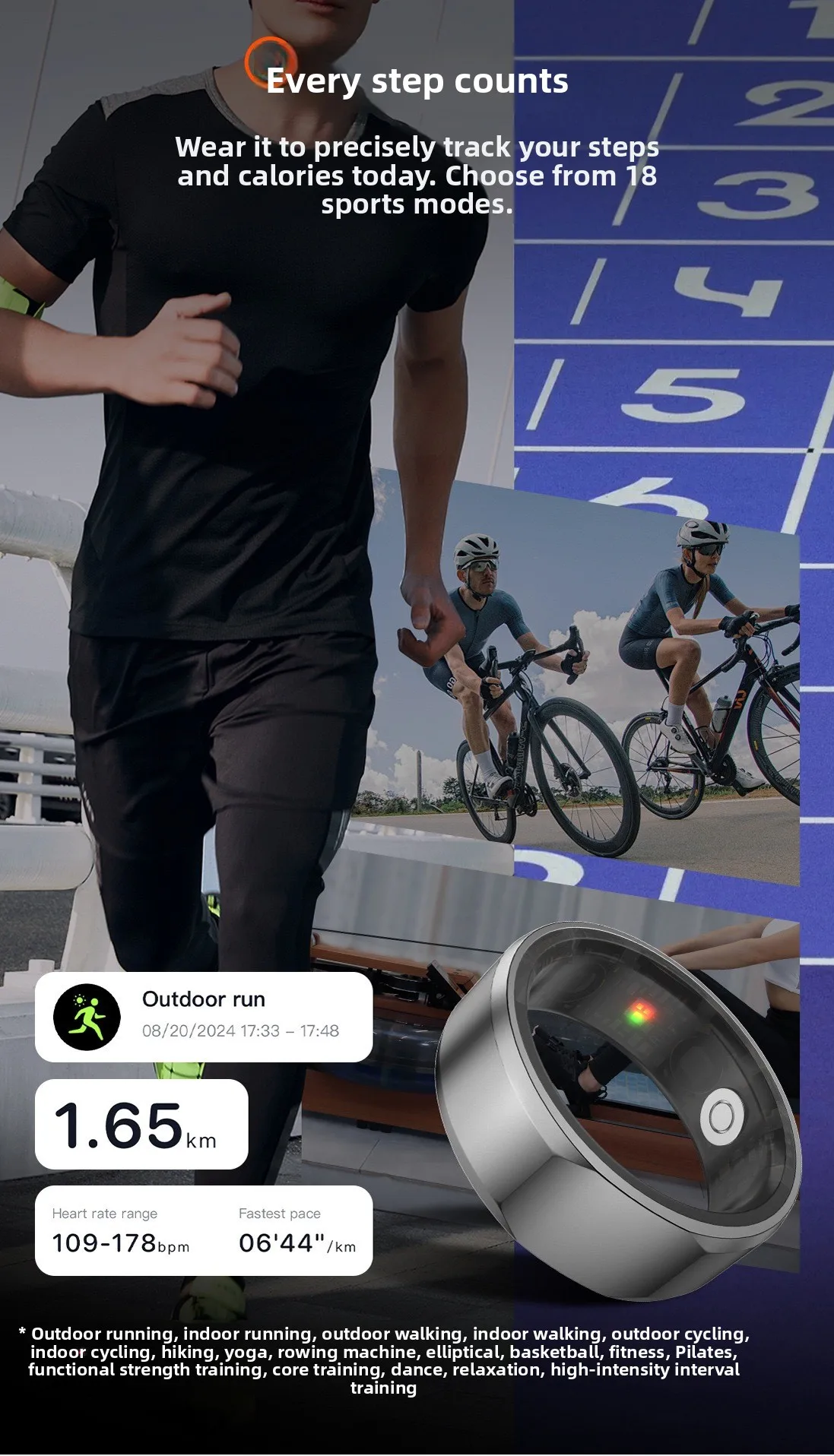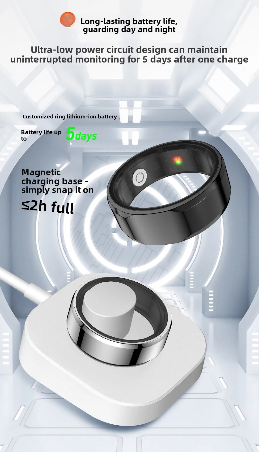 Con un grado di resistenza all’acqua di 5 ATM, questo anello intelligente è adatto per il nuoto e altre attività acquatiche.