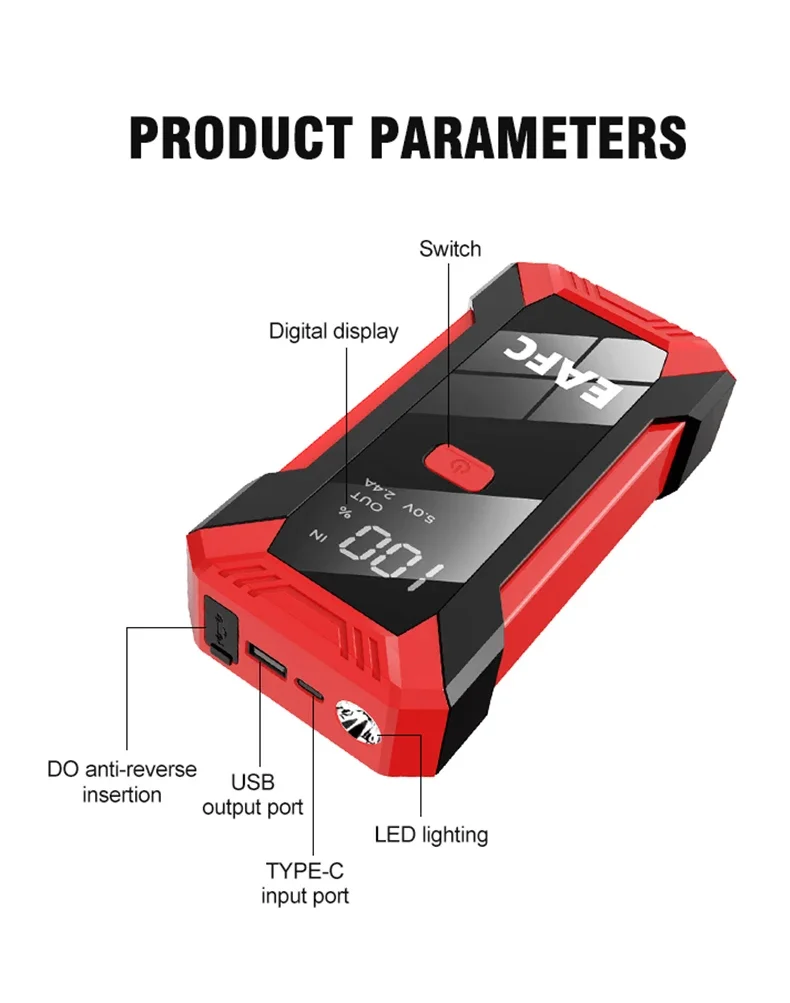 1.Il prodotto è appena stato ricevuto.Si prega di accendere prima la torcia per scaricarla, quindi caricare il prodotto per più di 4 ore prima di avviare l’auto, perché il prodotto contiene elettricità virtuale.Questa operazione può prolungare la durata del prodotto!