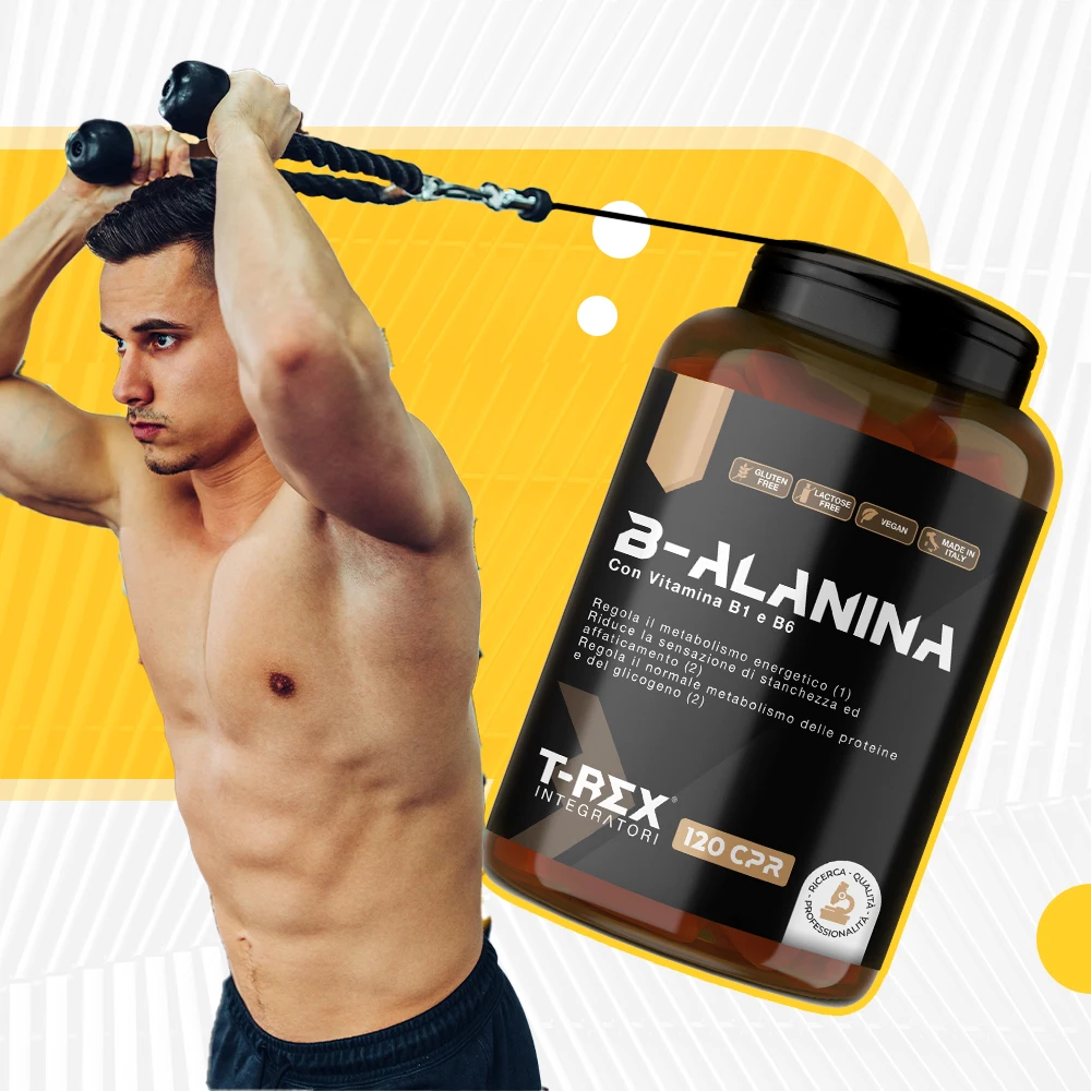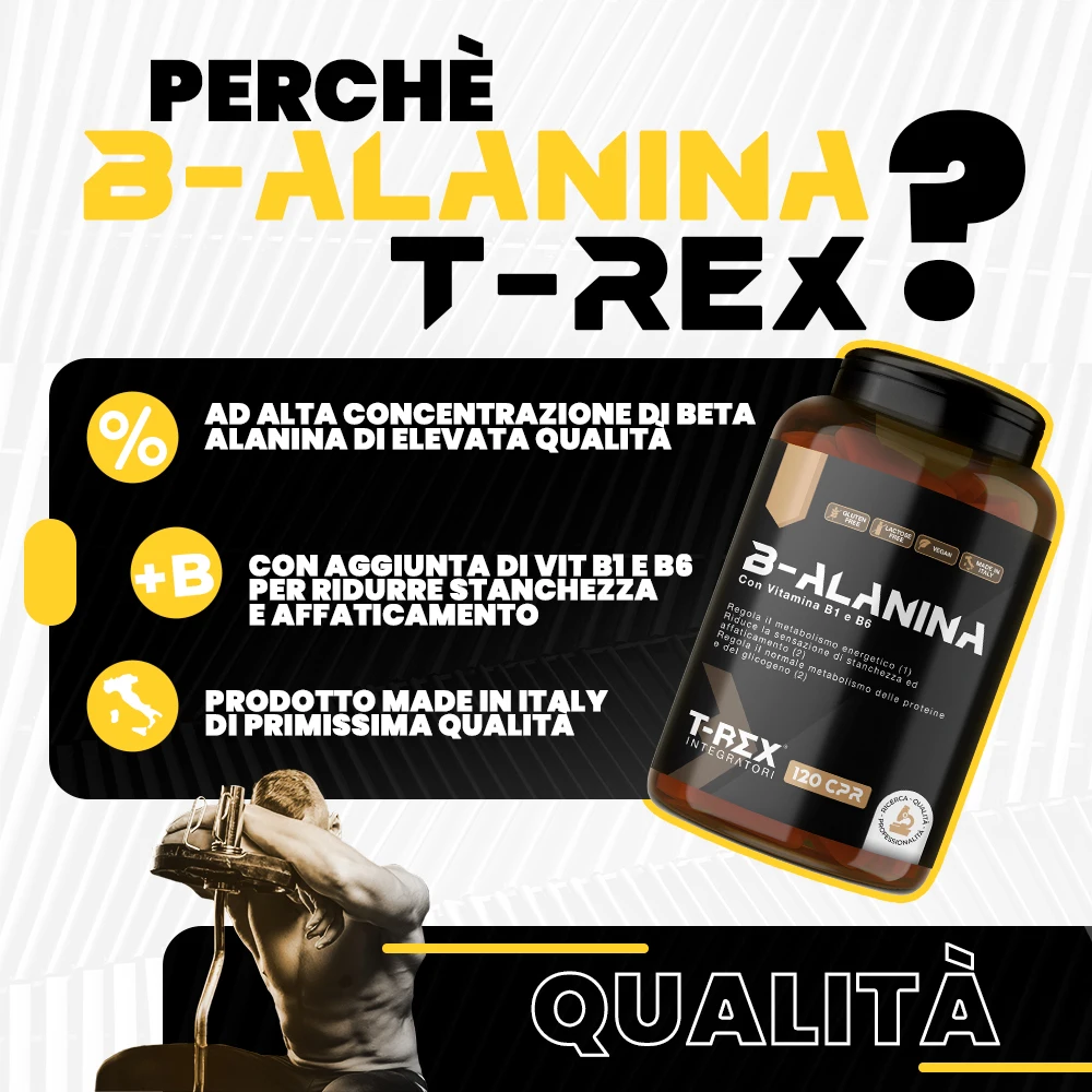 B-Alanina di T-Rex Integratori è un integratore a base di Beta Alanina arricchito con vitamine B1-B6, indicato per sportivi adulti che praticano un’attività fisica intensa ed utilizzano muscoli a contrazione rapida.Â
