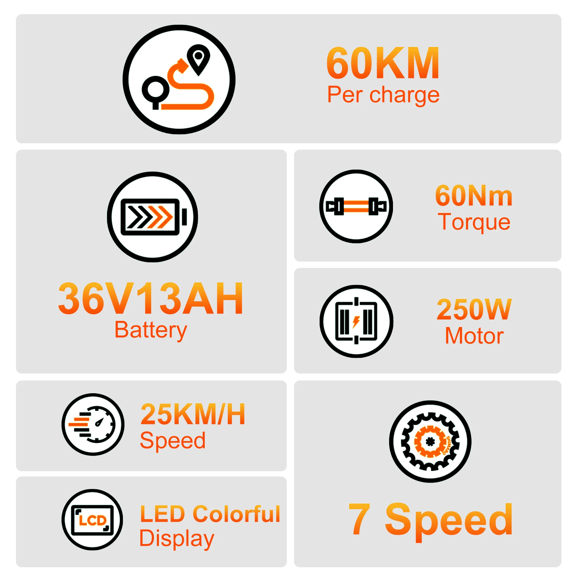 Questa bicicletta elettrica è dotata di un250 WMotore conforme con un limite di velocità perfettamente calibrato di25 chilometri all’ora, garantendo una guida completamente legale e senza preoccupazioni in tutta Europa.Leggero e agile, offre fino a65 chilometridi autonomia assistita—rendendolo la tua scelta efficiente, comoda ed ecologica per spostarti tra le strade della città o per le gite nel parco nel fine settimana.