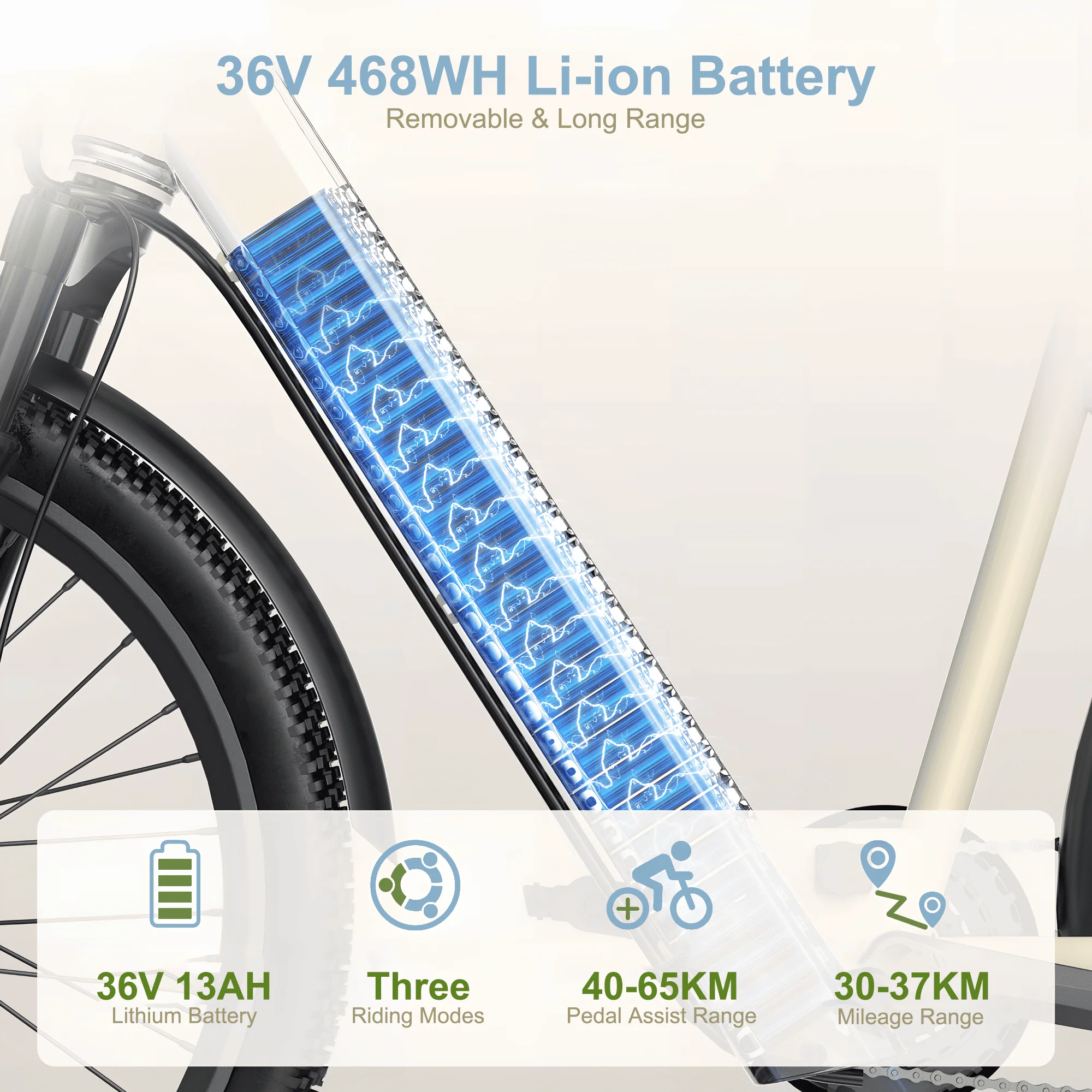 • Batteria 36V 13Ah con doppia modalità di autonomia — Raggiunge una portata di 40-65 km in modalità assistita, coprendo senza sforzo gli spostamenti quotidiani e i viaggi del fine settimana.La modalità completamente elettrica funge da riserva a risparmio energetico, adattandosi in modo flessibile alle diverse esigenze.