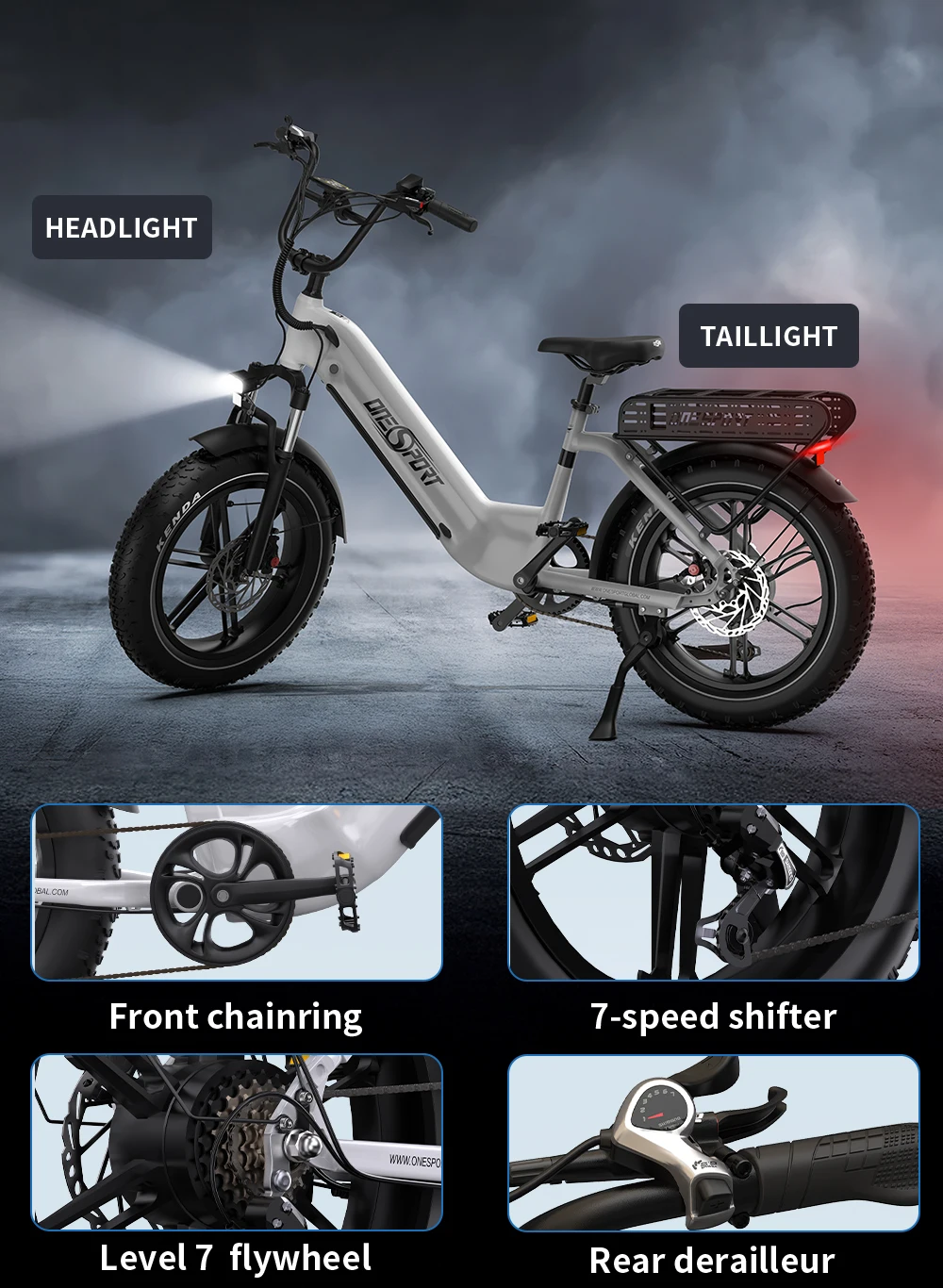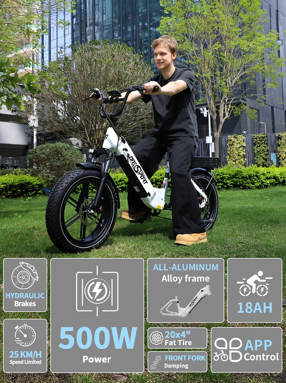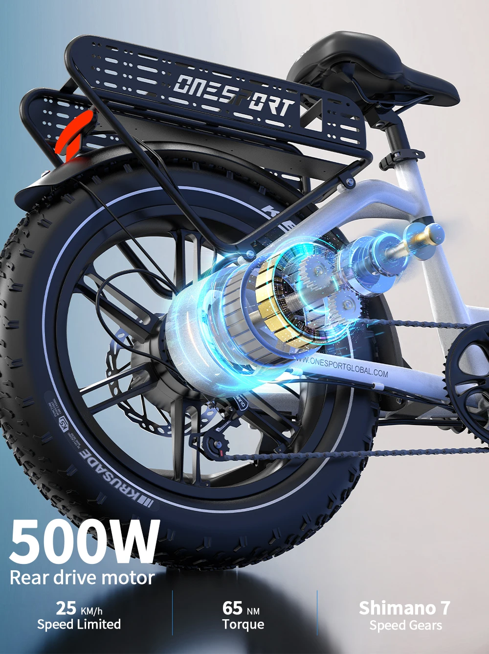 Bicicletta Elettrica da Montagna ONESPORT OT08 2026, Autonomia 90km, Motore 500W, Batteria 48V18AH, Pneumatici Fat 20″X4.0