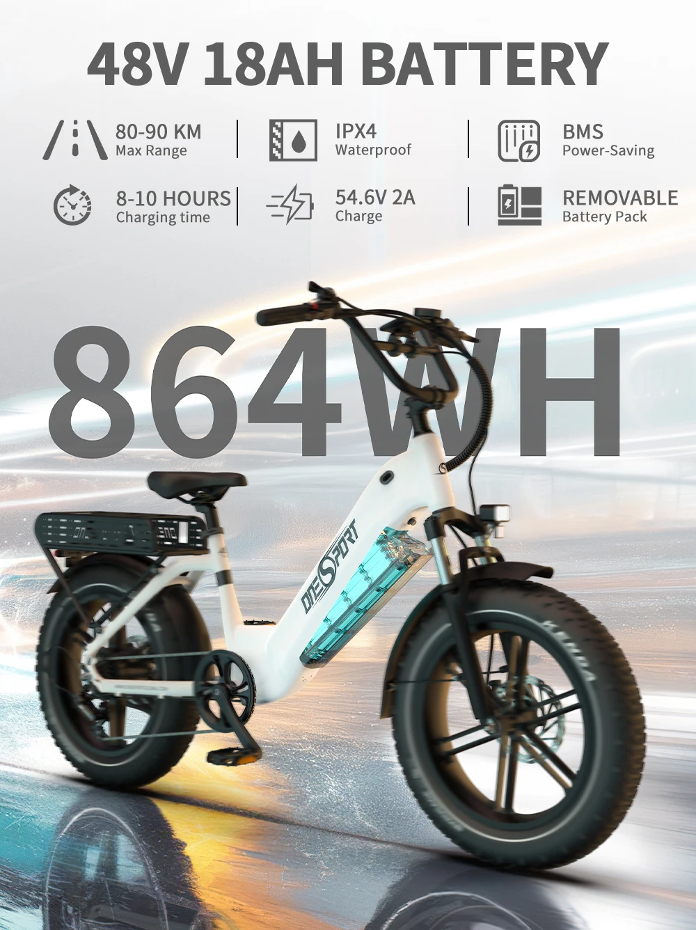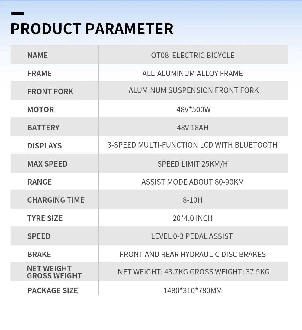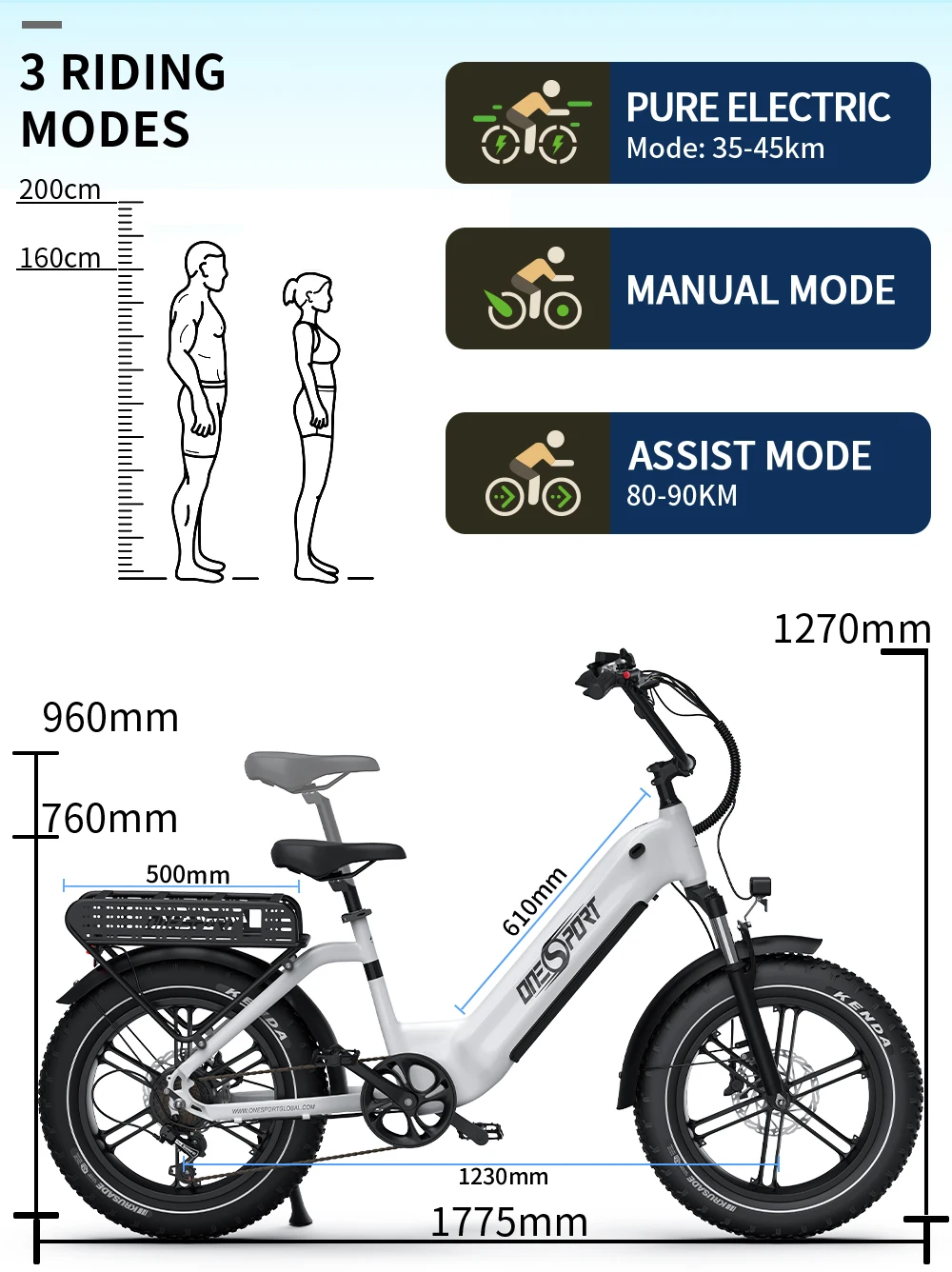 Bicicletta Elettrica da Montagna ONESPORT OT08 2026, Autonomia 90km, Motore 500W, Batteria 48V18AH, Pneumatici Fat 20″X4.0