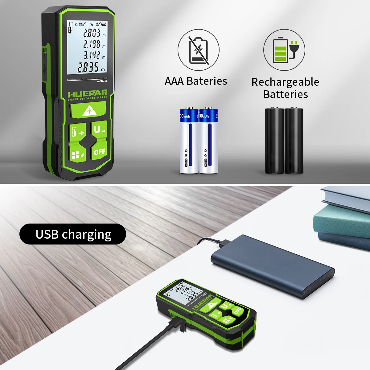 - Presenta dimensioni ridotte e un pratico design tascabile in modo che la misura laser possa stare in qualsiasi tasca.