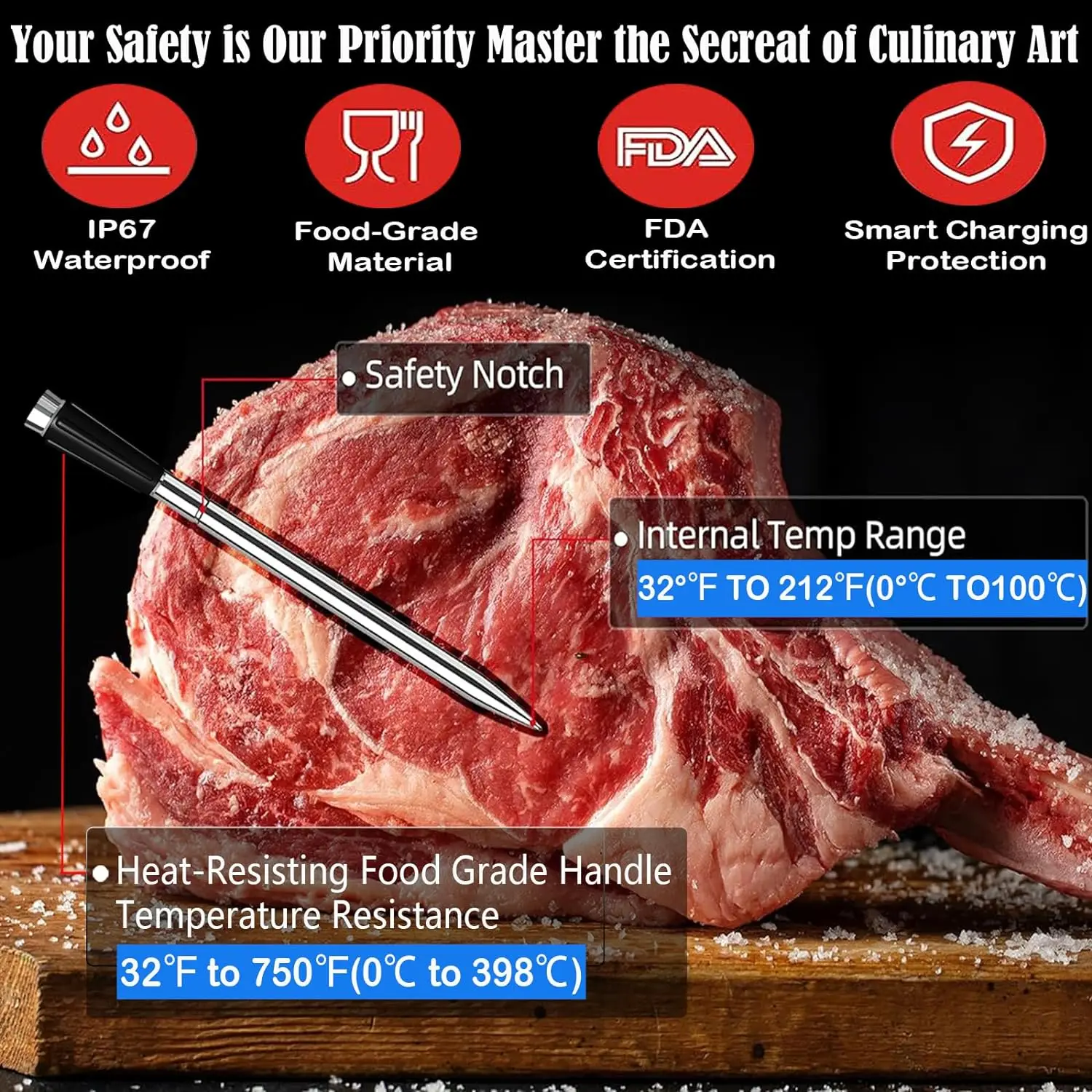 CARATTERISTICHE SONDE: Il nostro termometro wireless ha un design in acciaio inossidabile, è resistente all’acqua e facile da pulire.Può monitorare la temperatura interna della carne fino a 608°F, con precisione entro ±1,5°F.