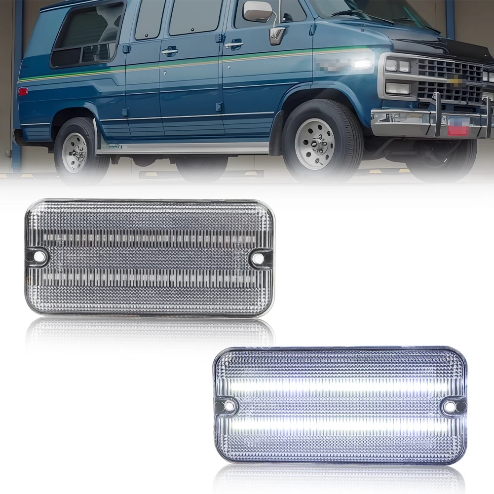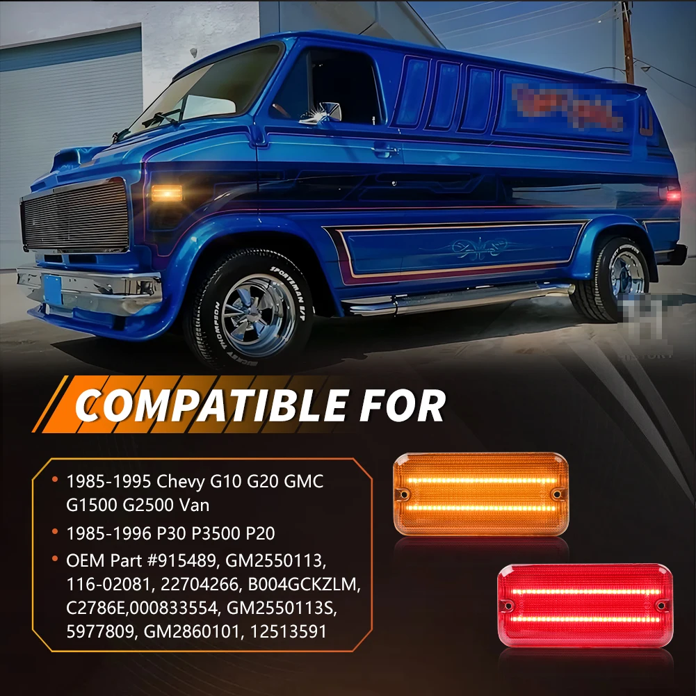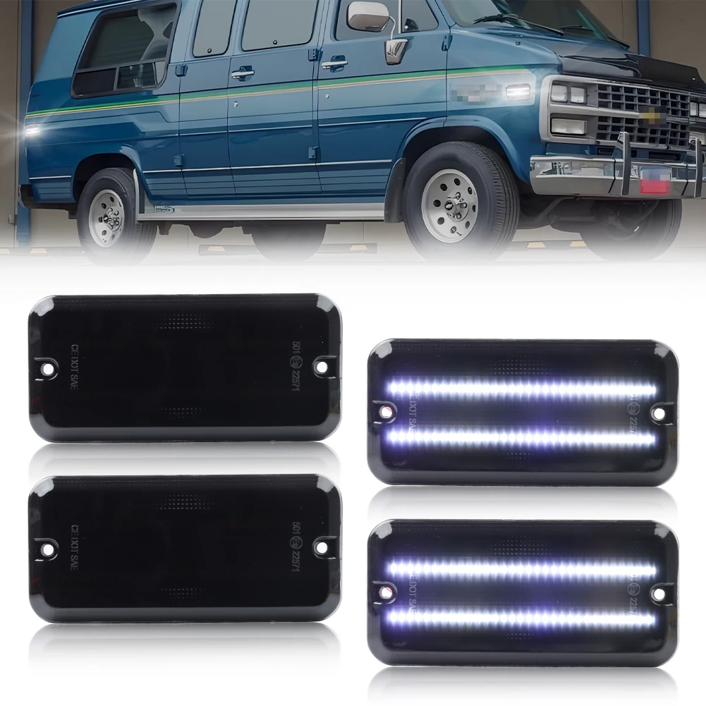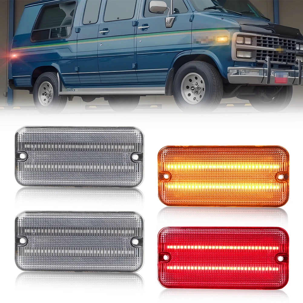 Questa pagina presenta una coppia (2 pezzi/4 pezzi) lenti fumé / trasparenti / ambra / rosse LED bianche / ambra / rosse luci di posizione laterali anteriori o posteriori per Chevrolet G10 G20 G30 P20 P30 GMC G1500 G2500 P2500 P3500 Van
