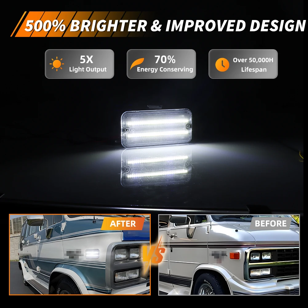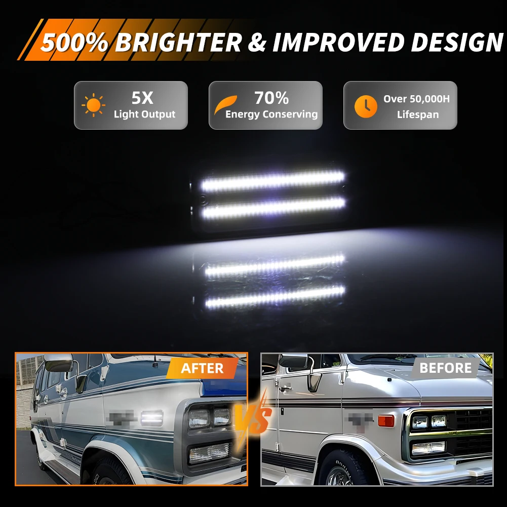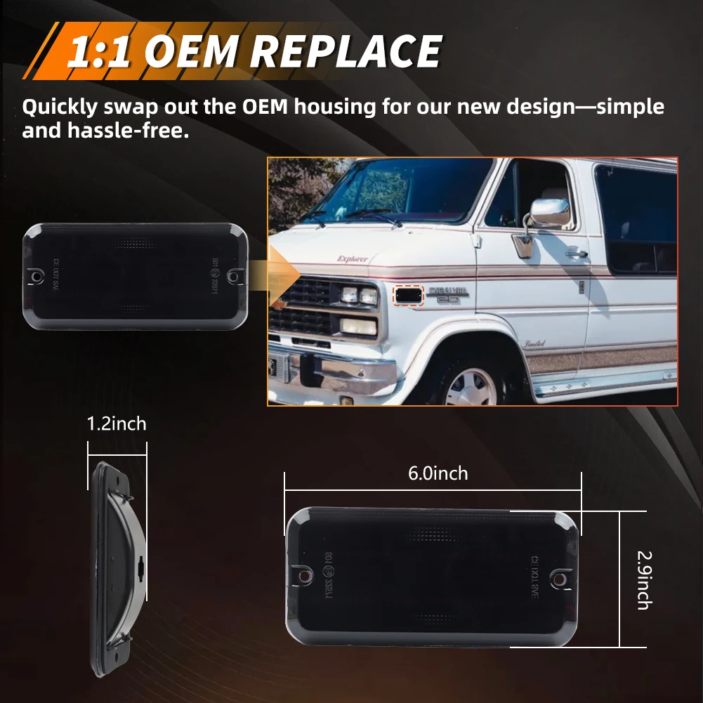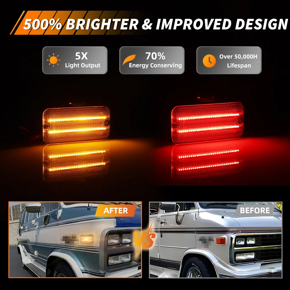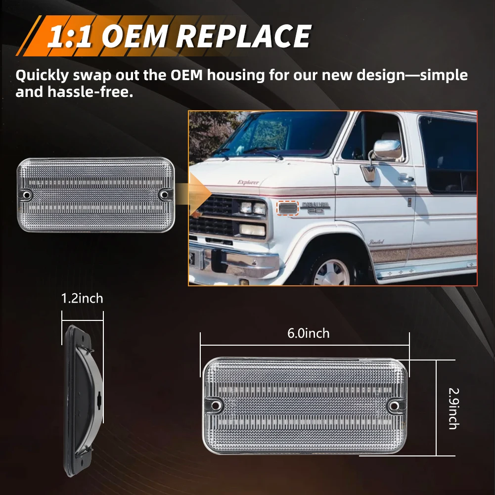 Questa pagina presenta una coppia (2 pezzi/4 pezzi) lenti fumé / trasparenti / ambra / rosse LED bianche / ambra / rosse luci di posizione laterali anteriori o posteriori per Chevrolet G10 G20 G30 P20 P30 GMC G1500 G2500 P2500 P3500 Van
