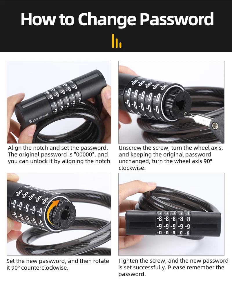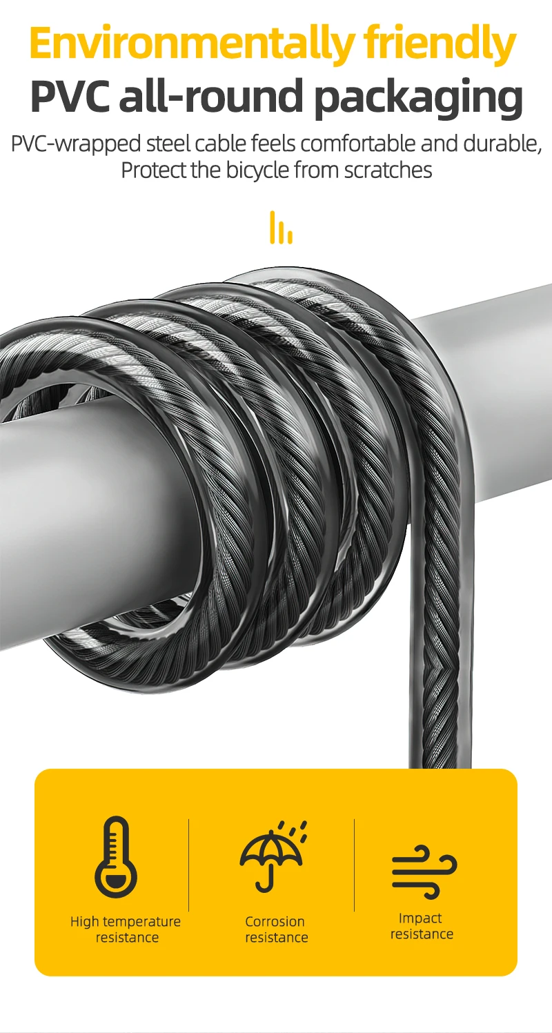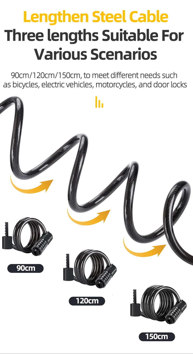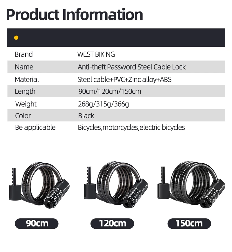 Lucchetto per Bicicletta WEST BIKING con Cavo e Codice a 5 Cifre, Antifurto di Sicurezza per Bici, Moto, E-bike, Accessori per MTB e Bici da Strada