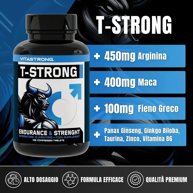 cellulosa; L-arginina base, maca andina (Lepidium meyenii Walp., radice) e.s. tit. 0,5% beta-ecdisone, fieno greco (Trigonella foenum-graecum L., seme) e.s. tit. 50% saponine tot., bisglicinato di zinco, ginkgo biloba (Ginkgo biloba L., foglia) e.s. tit. 24% ginkgoflavonoidi e 6% lattoni terpenici tot., ginseng (Panax ginseng C.A. Mey., radice) e.s. tit. 12 % ginsenosidi, L-taurina, agenti antiagglomeranti: sali di magnesio degli acidi grassi, biossido di silicio; cloridrato di piridossina (Vitamina B6). Indicazioni: