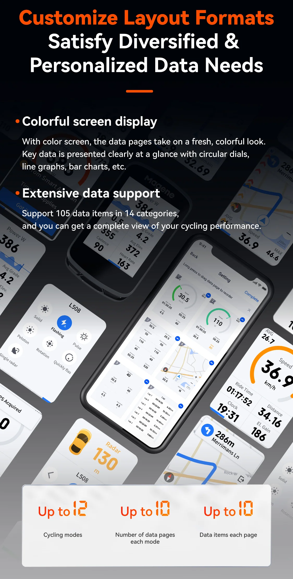 Ampio supporto ai datiSupporta 105 elementi dati in 14 categorie e puoi ottenere una visione completa delle tue prestazioni ciclistiche.
