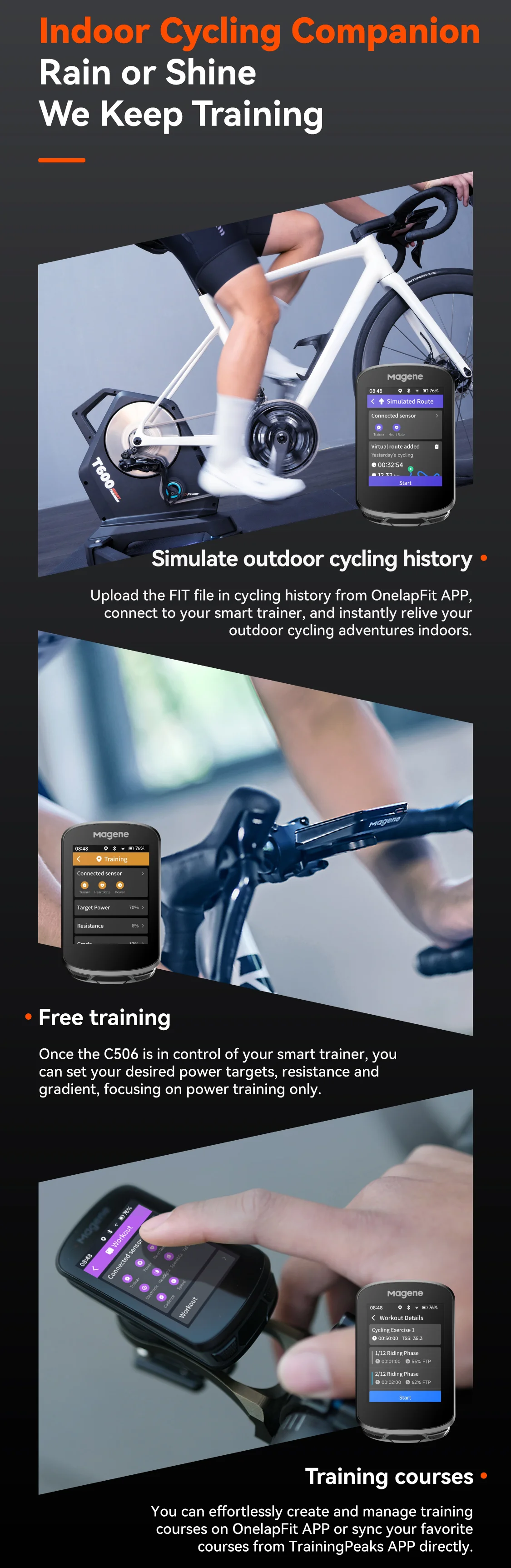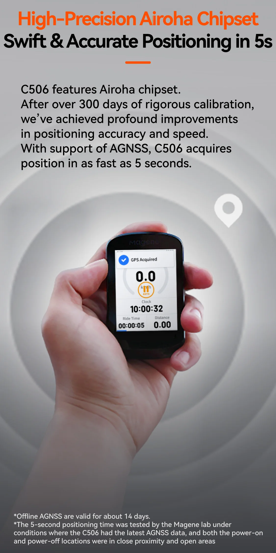 C506 è dotato del chipset Airoha.Dopo oltre 300 giorni di rigorosa calibrazione, abbiamo ottenuto un miglioramento profondo grazie alla precisione e alla velocità del posizionamento.Con il supporto di AGNSS, C506 acquisisce la posizione in soli 5 secondi.Compagno di ciclismo indoor Pioggia o sole Continuiamo ad allenarti