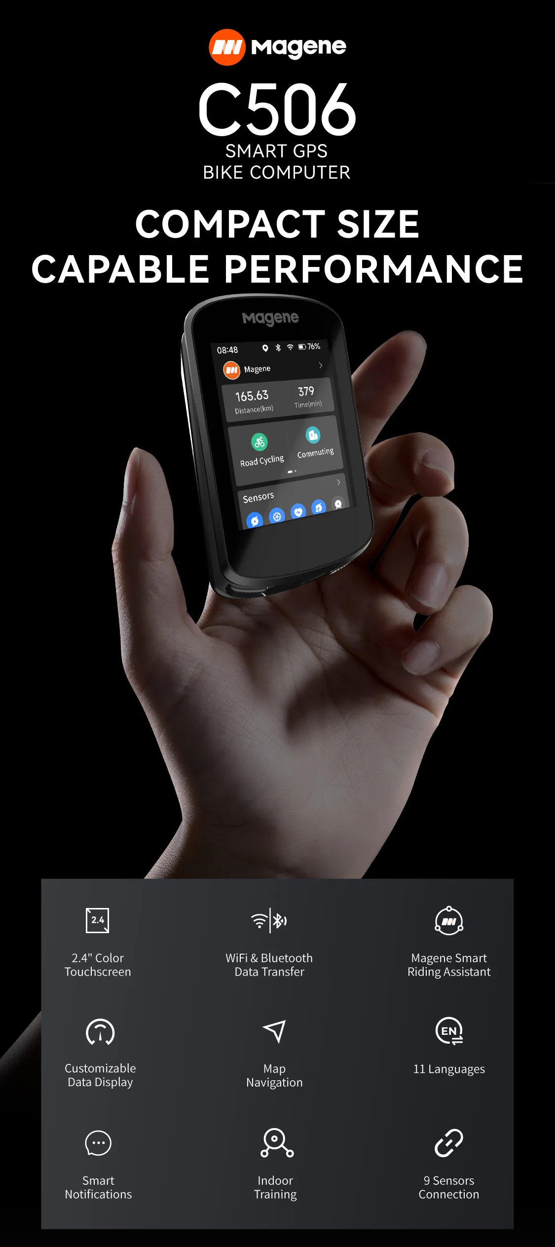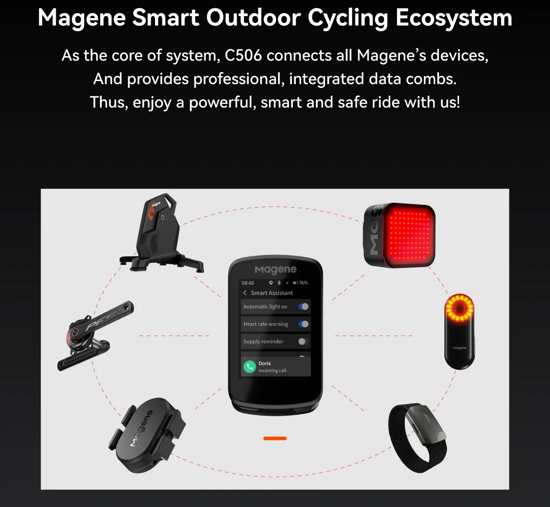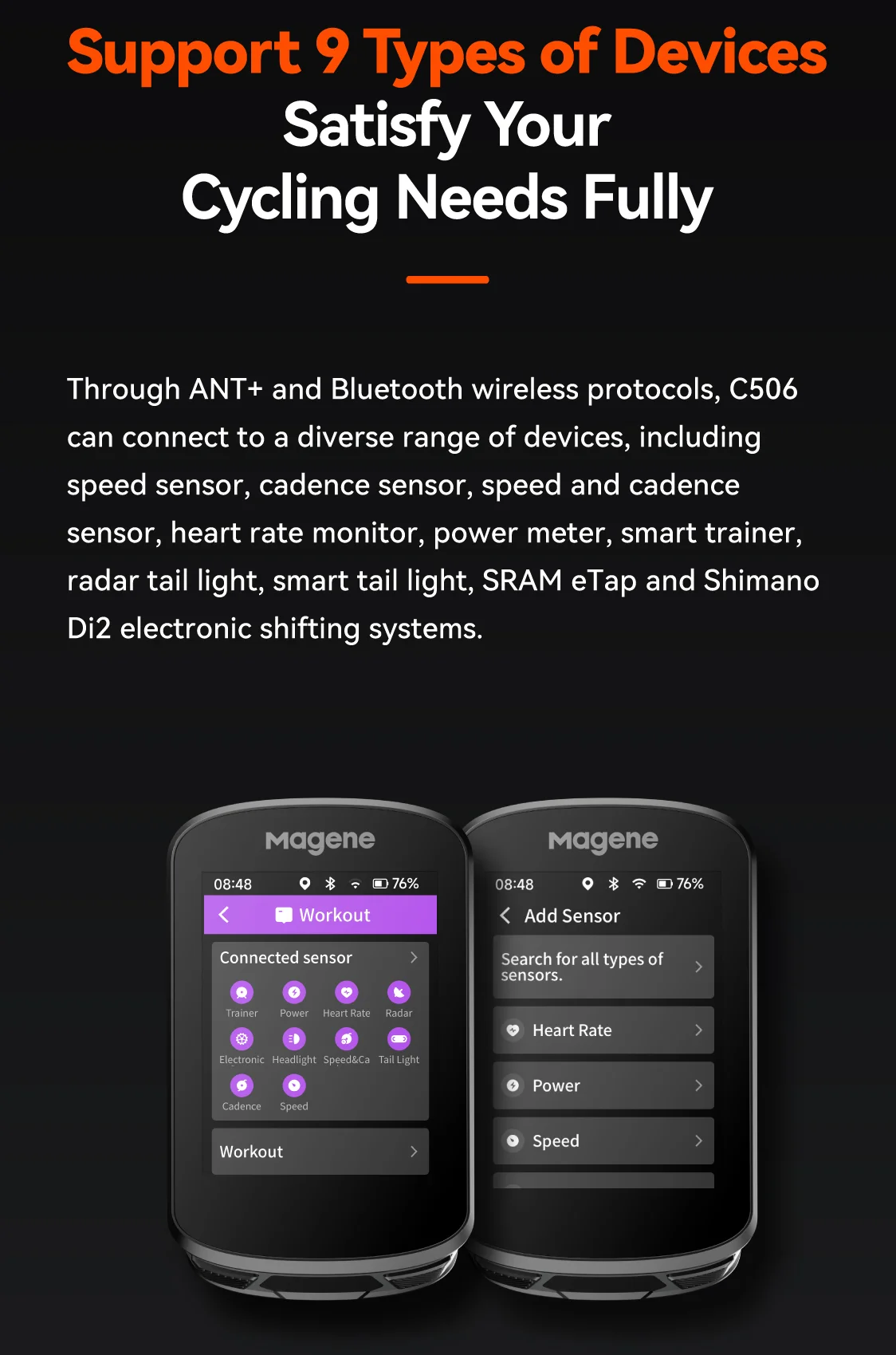 Attraverso i protocolli wireless ANT+ e Bluetooth, C506 può connettersi a una vasta gamma di dispositivi, tra cui sensore di velocità, sensore di cadenza, sensore di velocità e cadencesensor, monitor della frequenza cardiaca, misuratore di potenza, fanale posteriore radar intelligente, fanale posteriore intelligente, SRAM eTap e Shimano Di2 sistemi di cambio elettronico.Design più potenti