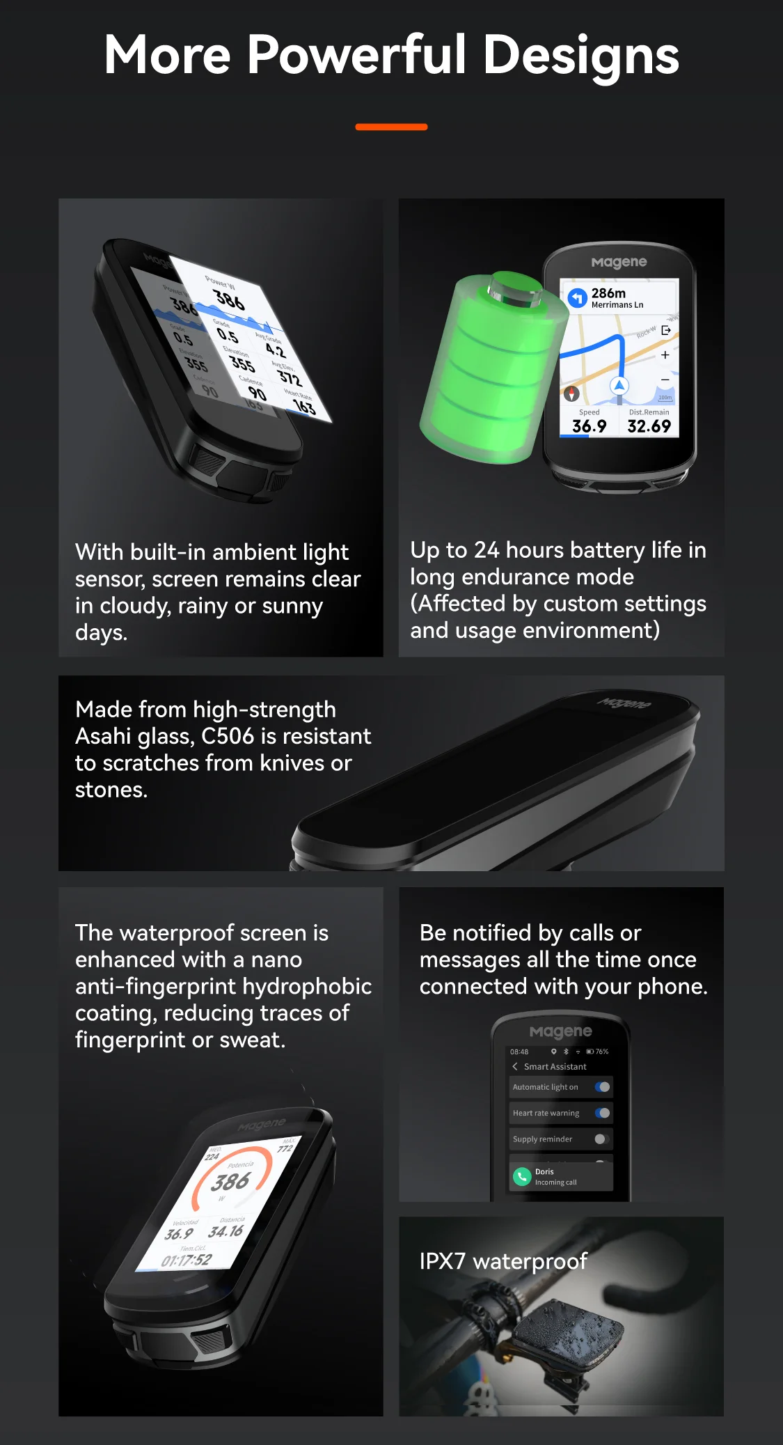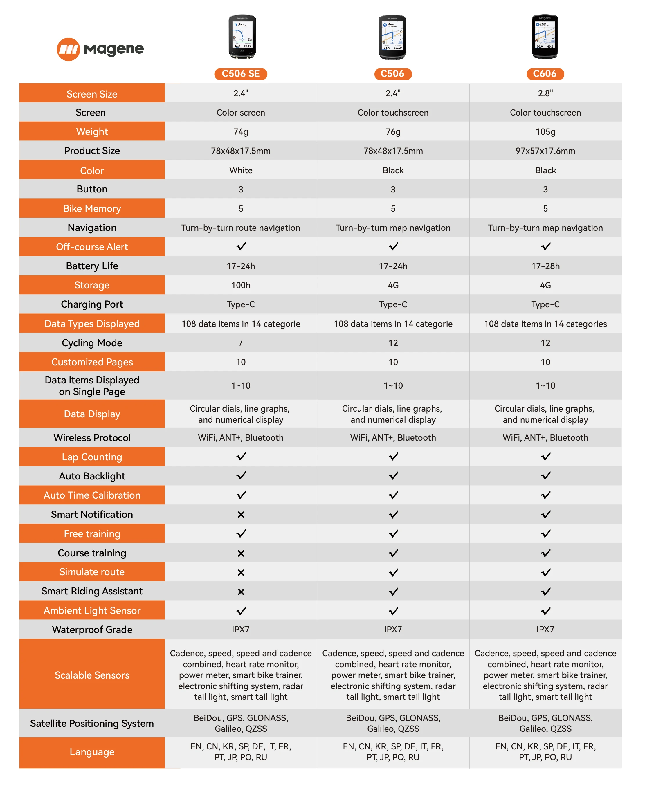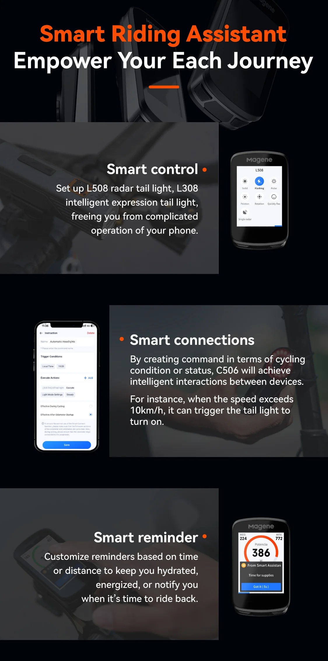 Attraverso i protocolli wireless ANT+ e Bluetooth, C506 può connettersi a una vasta gamma di dispositivi, tra cui sensore di velocità, sensore di cadenza, sensore di velocità e cadencesensor, monitor della frequenza cardiaca, misuratore di potenza, fanale posteriore radar intelligente, fanale posteriore intelligente, SRAM eTap e Shimano Di2 sistemi di cambio elettronico.Design più potenti