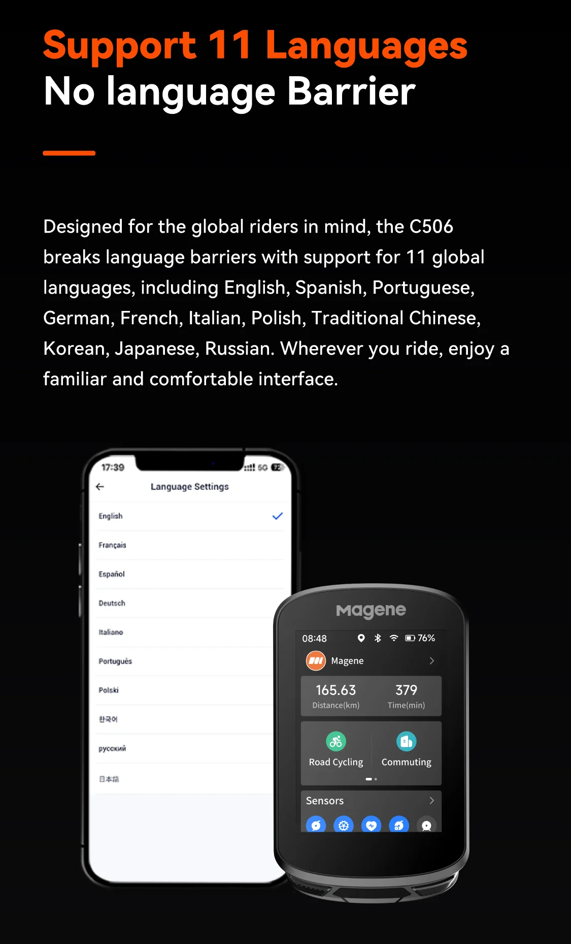 Progettato pensando ai ciclisti globali, il C506 rompe le barriere linguistiche con il supporto di 11 lingue globali, tra cui inglese, spagnolo, portoghese, tedesco, francese, italiano, polacco, cinese tradizionale, coreano, giapponese, russo.Ovunque tu guidi, goditi un’interfaccia familiare e confortevole.Supporta 9 tipi di dispositivi per soddisfare pienamente le tue esigenze ciclistiche