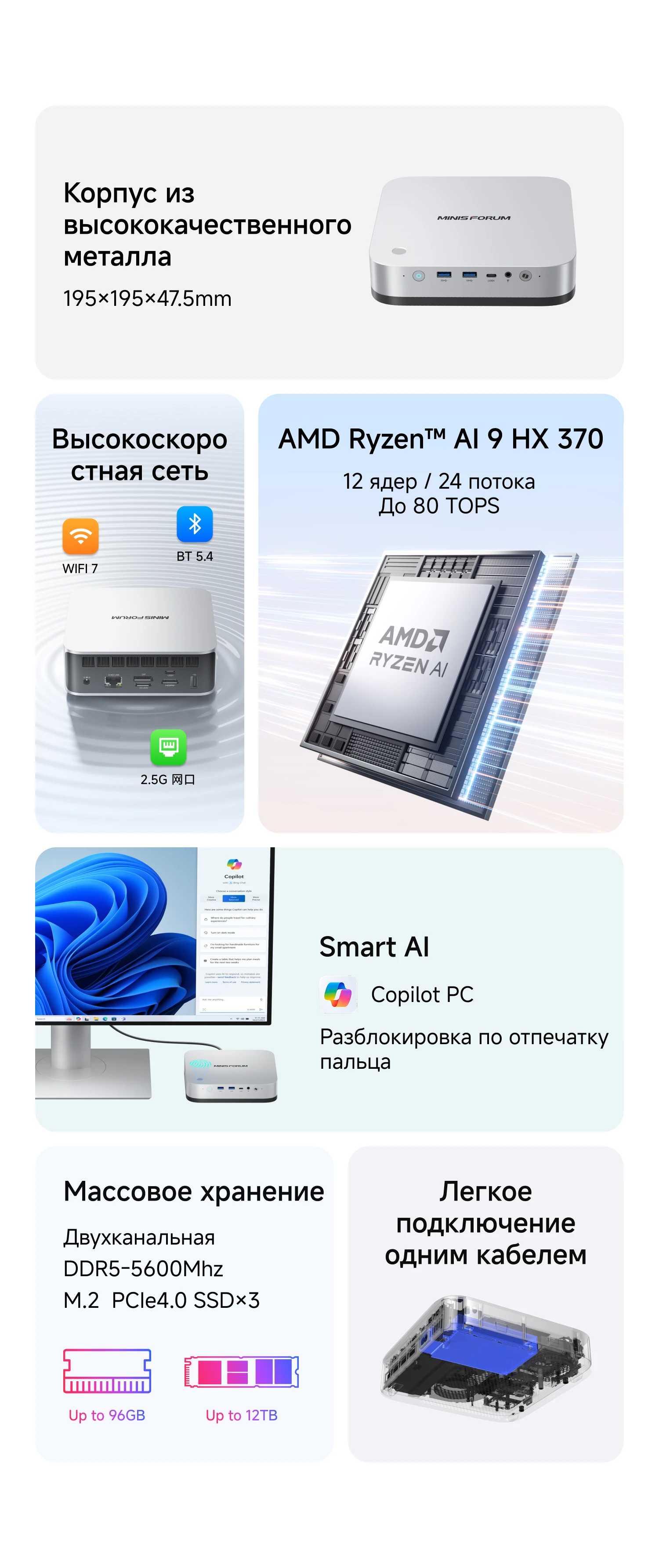 MINISFORUM AI X1 Pro Mini PC AMD Ryzen AI 9 HX 370 DDR5 96GB 2TB WiFi 7 Copilota AI 135W Adattatore Dual 2.5G LAN Ufficio PC Gaming