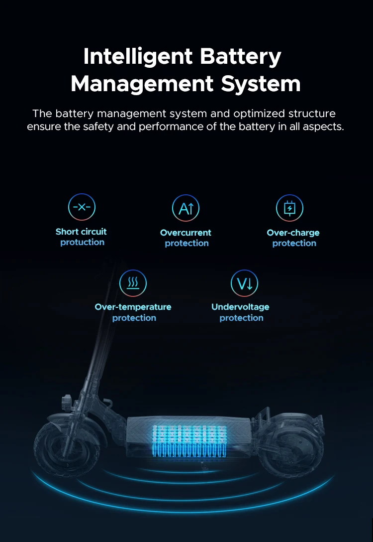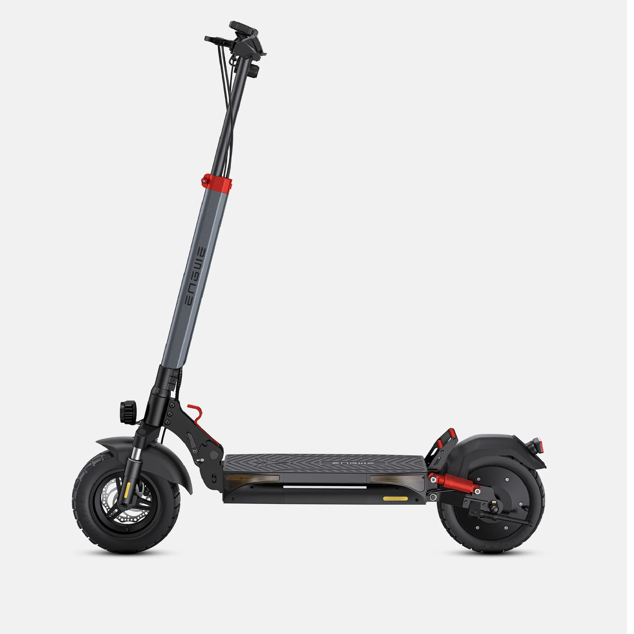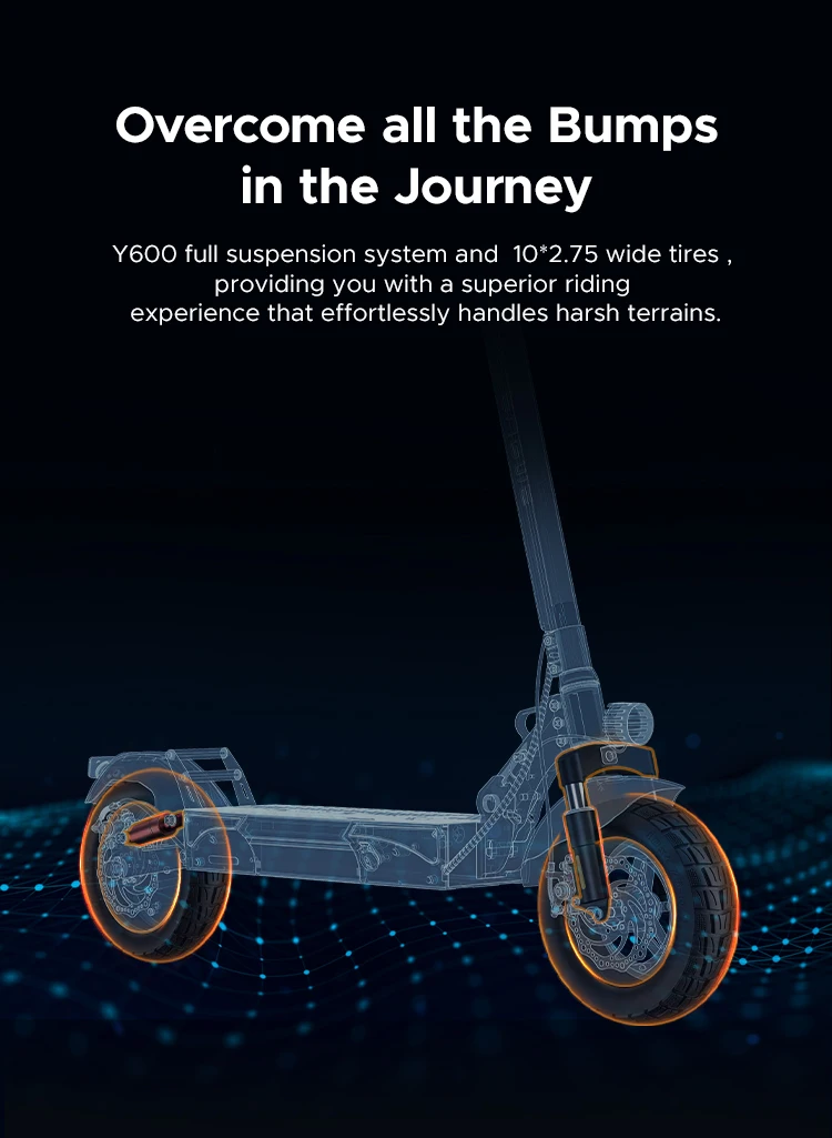 Il modello Y600S è dotato di un sistema di sospensione che include un ammortizzatore sulla forcella anteriore, un ammortizzatore posteriore e una molla sul reggisella, per assorbire facilmente urti e superfici irregolari.Dotato di pneumatici larghi 10×2,75 pollici, questo scooter offre una guida stabile e confortevole su strade cittadine, sentieri sterrati o percorsi nei parchi.