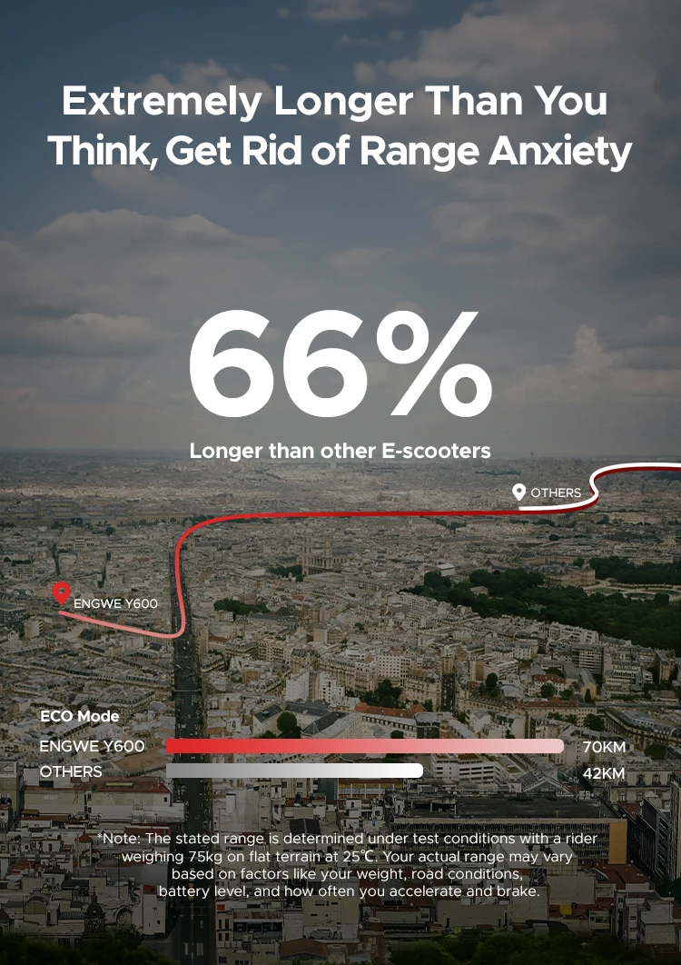 L’Y600S è dotato di una batteria ad alta capacità da 48V 18Ah, che offre un’autonomia di 70 chilometri con una singola carica.