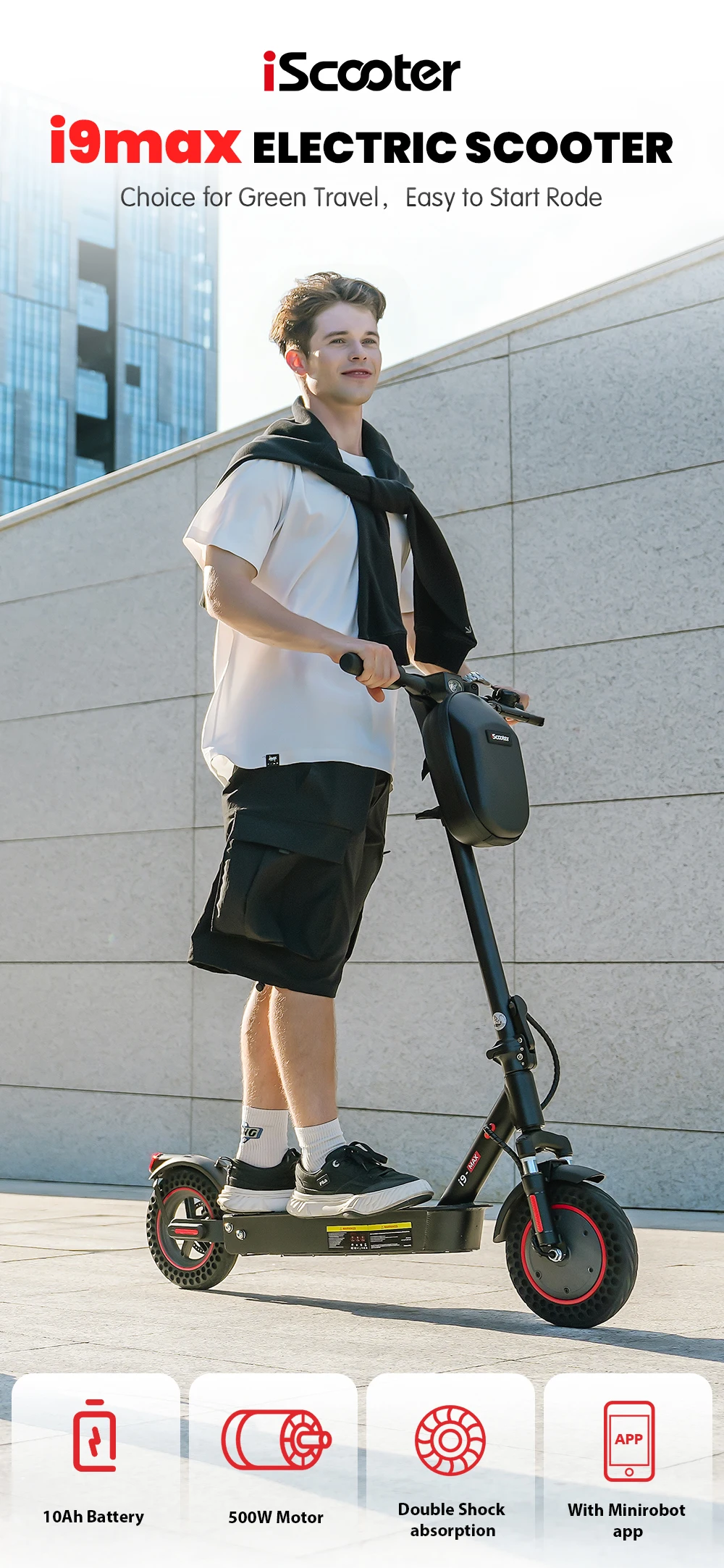 Monopattino elettrico iScooter i9 Max con motore da 500W, batteria al litio da 36V 10Ah, autonomia massima di 40 km, velocità massima di 35 km/h.