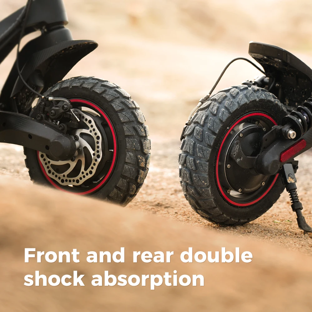Il monopattino elettrico iX7 Pro è dotato di pneumatici pneumatici da 10 pollici per tutti i terreni, in grado di affrontare facilmente condizioni meteorologiche avverse e terreni accidentati, inclusi strade sabbiose e ghiaiose.I pneumatici assorbono l’impatto delle asperità della strada, migliorando il comfort di guida.I pneumatici tubeless riducono il rischio di scoppi o perdite, sono più durevoli e funzionano in modo affidabile anche in ambienti difficili.Dotato di un sistema di doppia frenata, riduce efficacemente l’affaticamento del ciclista, rendendo il viaggio più confortevole e sicuro.