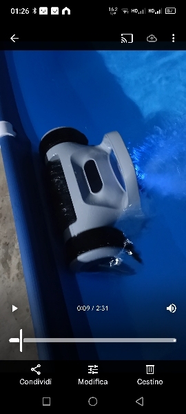 ottimo molto professionale in 20 minuti ha pulito il fondale della piscina 5m x 2m impostando sull’app solo pulitura fondo impostando tutto fa le pareti fino ad uscire un po’ fuori e raccogliere la sporcizia che si attacca sulle pareti. le impostazioni si cambiano appena acceso e avviare l’app e si collega da solo tramite bluetooth. sono molto soddisfatto