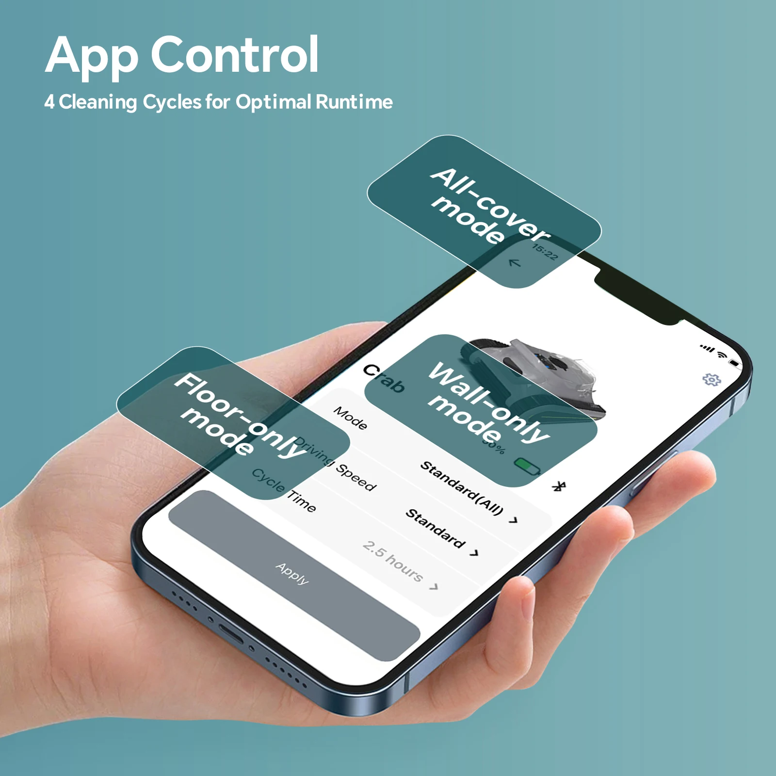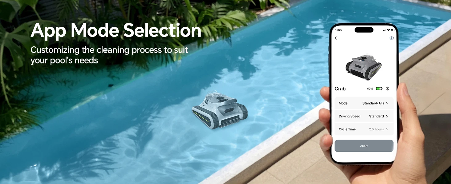 2. Crab will automatically clean up your swimming pool and automatically plan the route. You don’t need to choose any mode. It will cover your swimming pool fully, clean up the wall first and then clean up the bottom of the pool