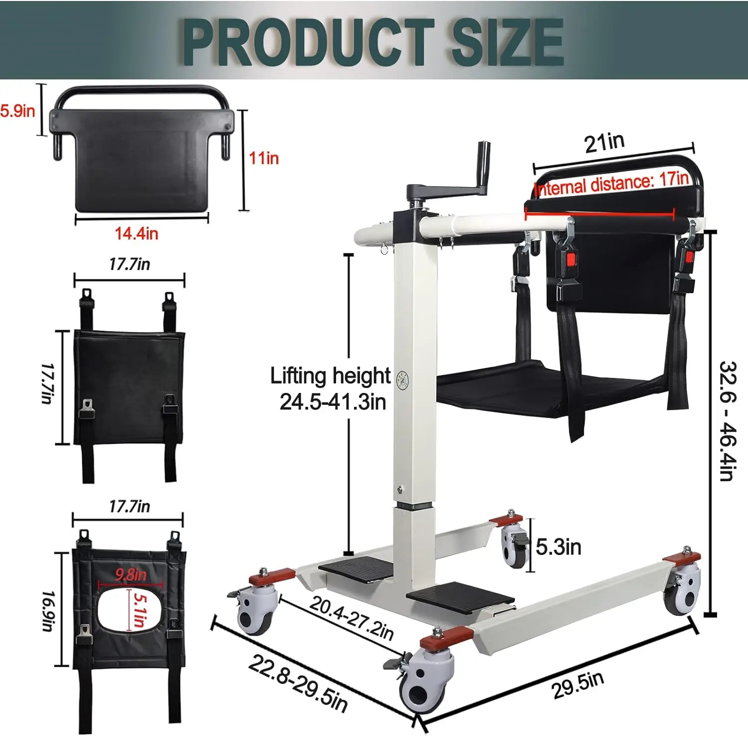 【Trasferimento sicuro e affidabile】 Non è necessario sollevare il paziente, rendendo i trasferimenti semplici e senza sforzo.La sedia di trasferimento è adatta a vari mobili, risolvendo il problema del trasferimento da sedie a rotelle a automobili, divani, letti, servizi igienici e sedie.La larghezza può essere regolata liberamente tra 22,8 e 29,5 pollici, adatta per larghezza porta, larghezza WC, larghezza sedia a rotelle e larghezza divano.L’altezza può essere regolata tra 33,5 e 45 pollici scuotendo la manovella, adatta a persone con una larghezza corporea inferiore a 18 pollici.