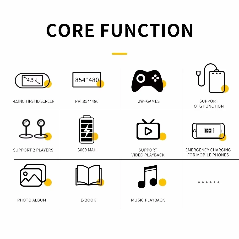 Sperimenta una grafica vivida sullo schermo IPS da 4,5 pollici con una risoluzione di 854×480, perfetto per i giochi retrĂ².