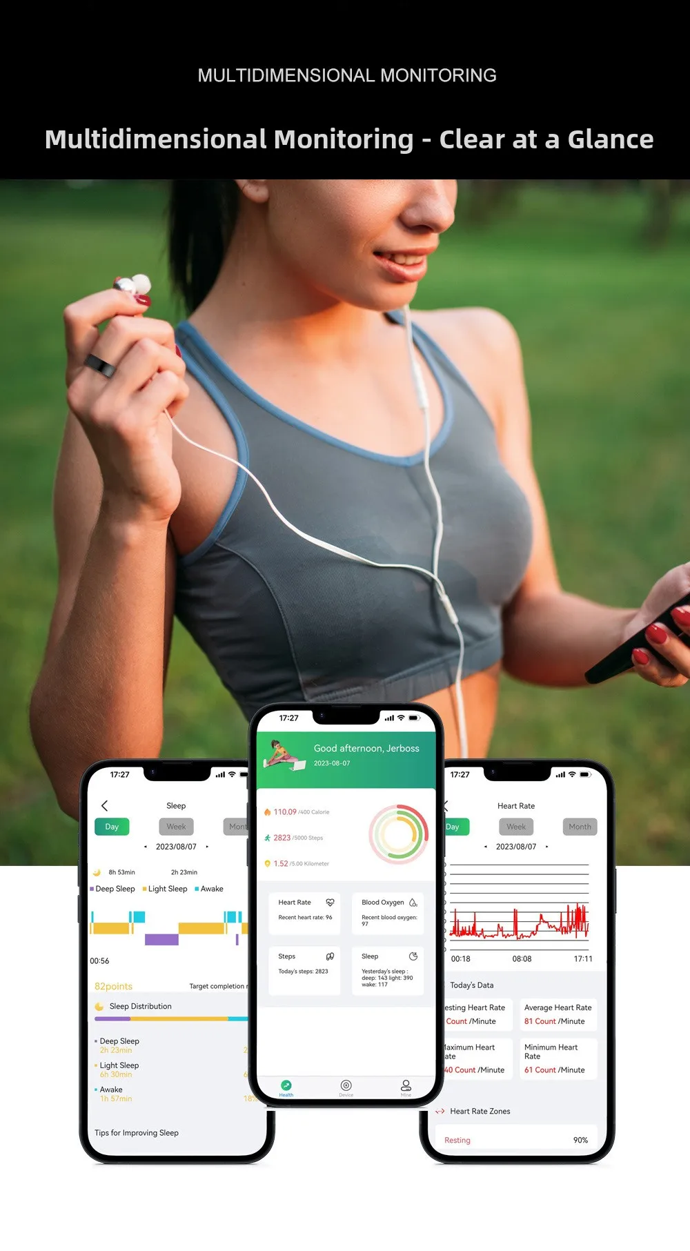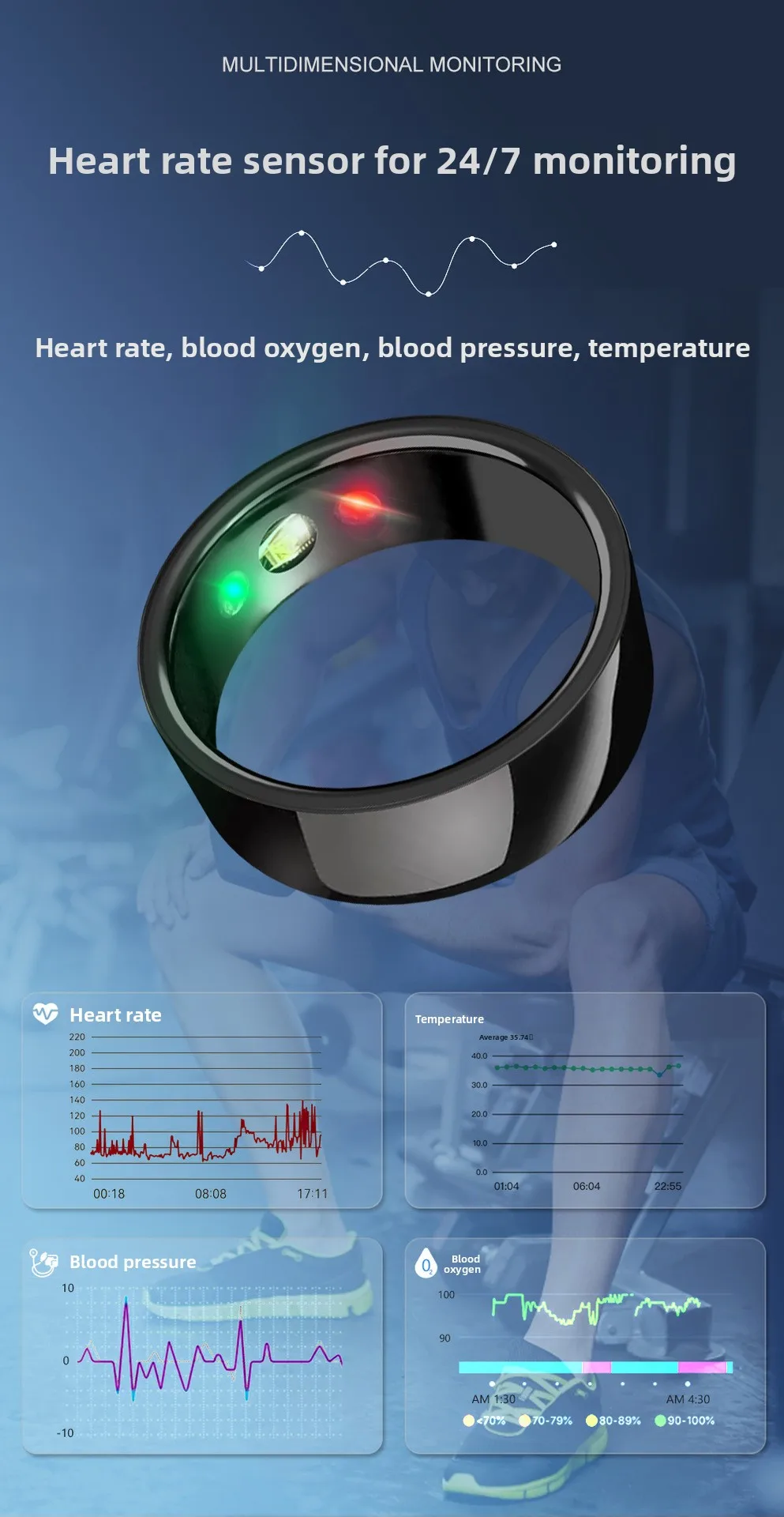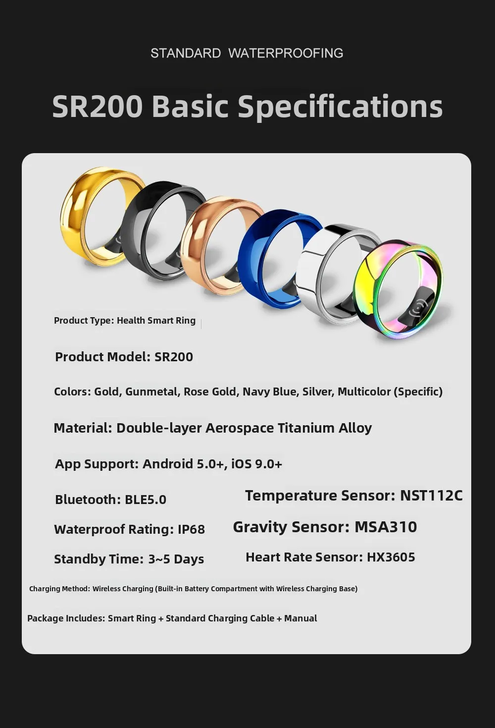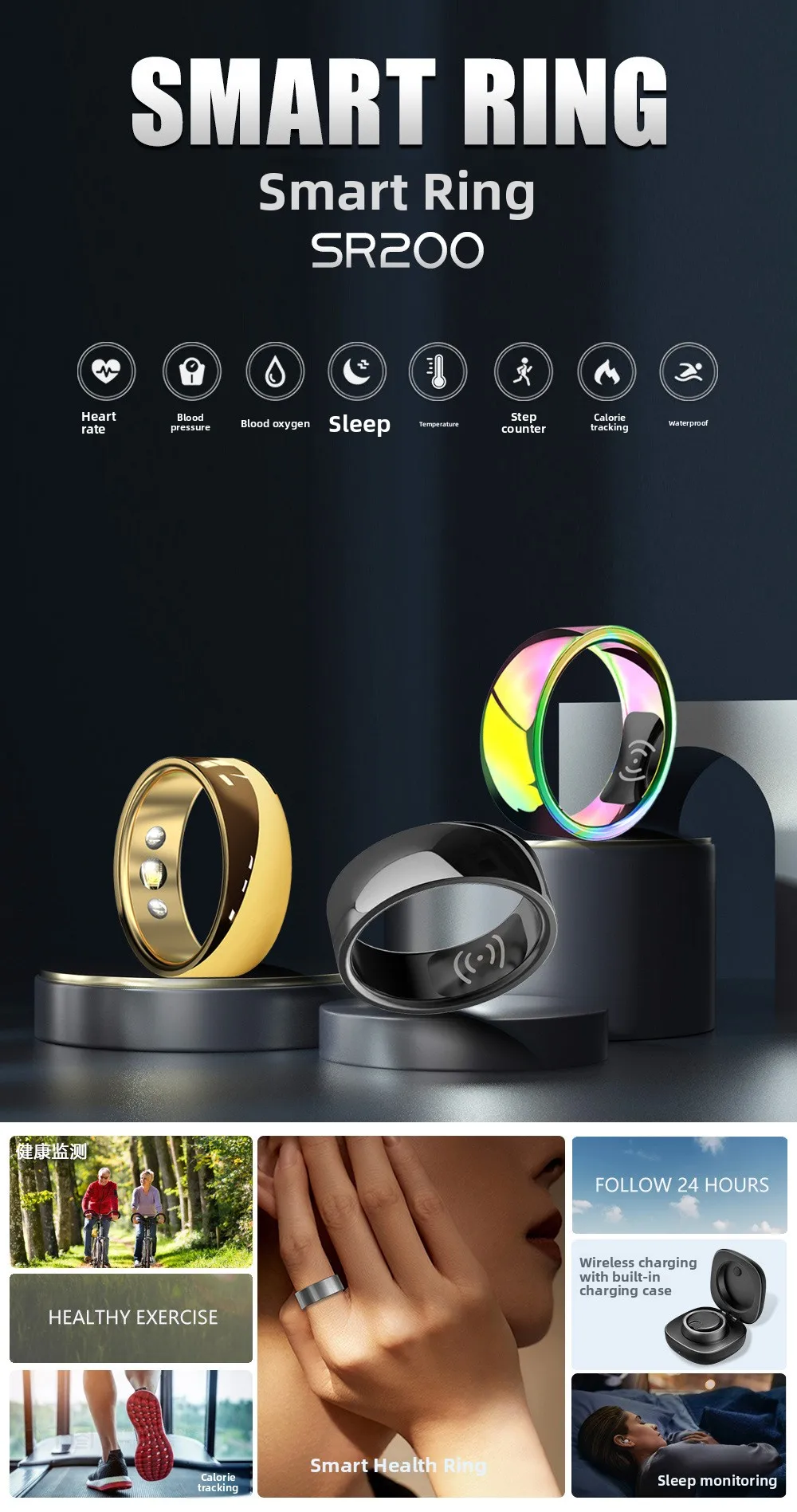 Smart Ring SR200 Monitoraggio del sonno multidimensionale Contapassi Misuratore dell’ossigeno nel sangue Monitor della frequenza cardiaca di M Juniu