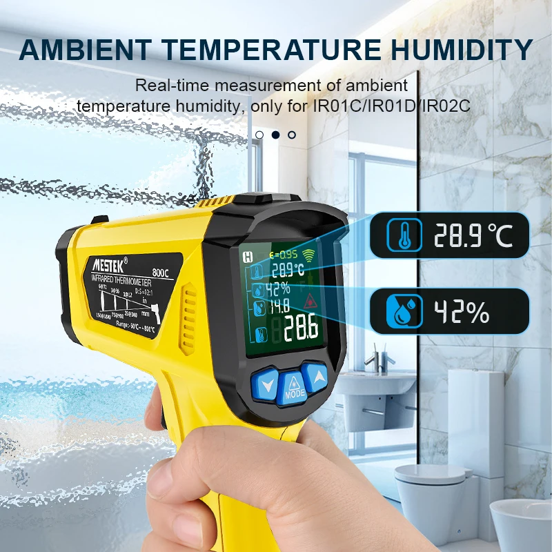 Modello 800C: -50~800°C, funzione termocoppia, umidità della temperatura ambiente, punto di voglia, misurazione della muffa, può misurare liquidi