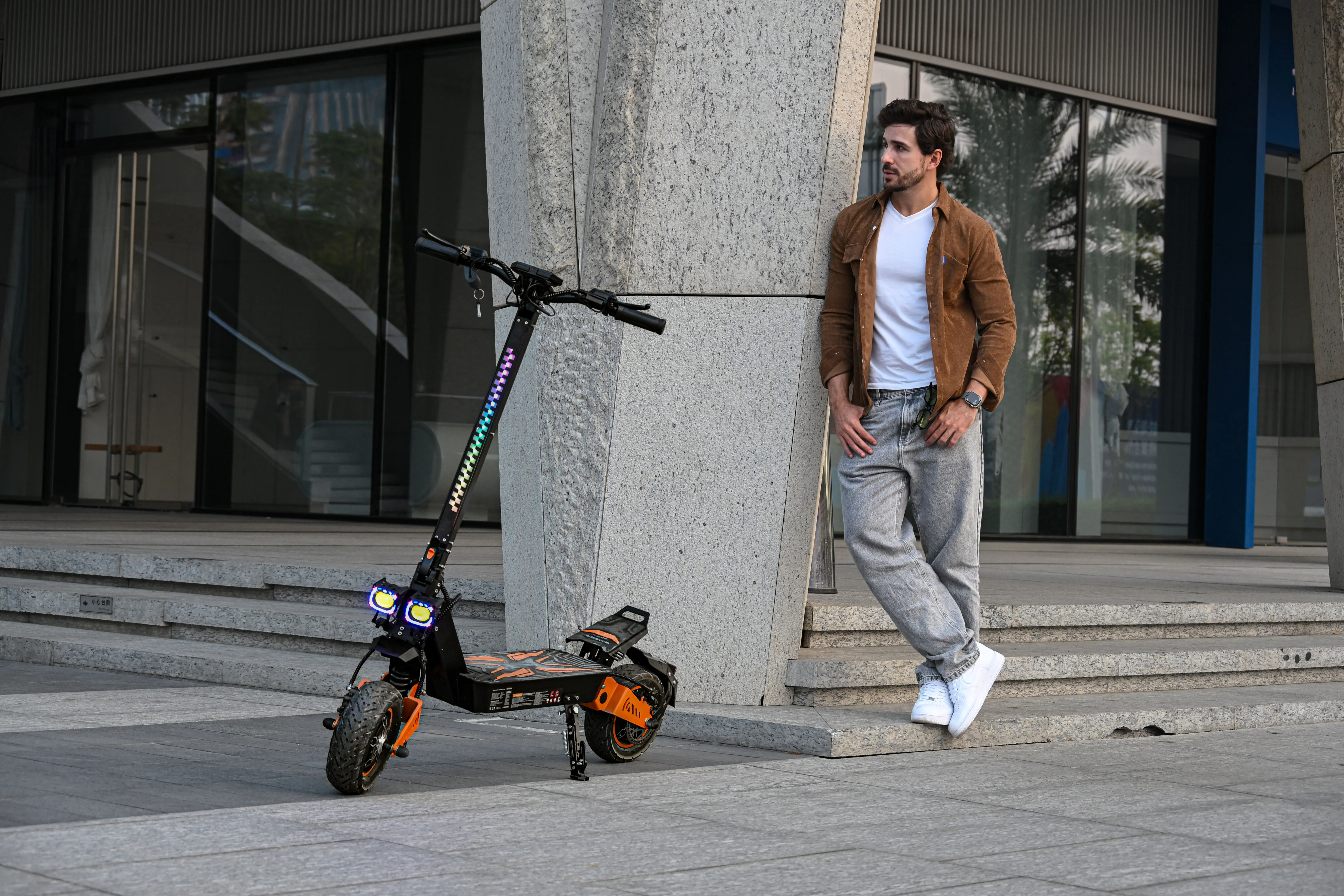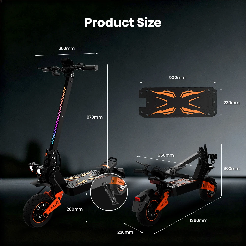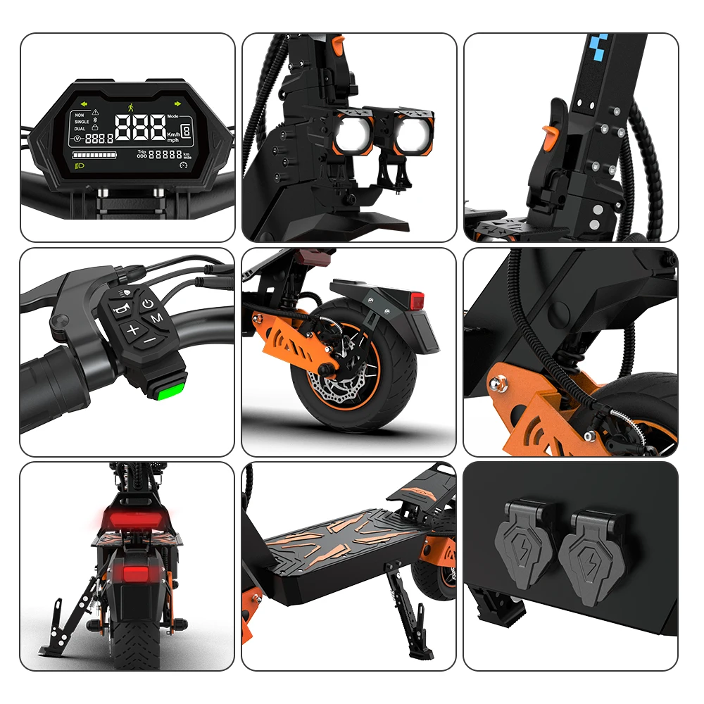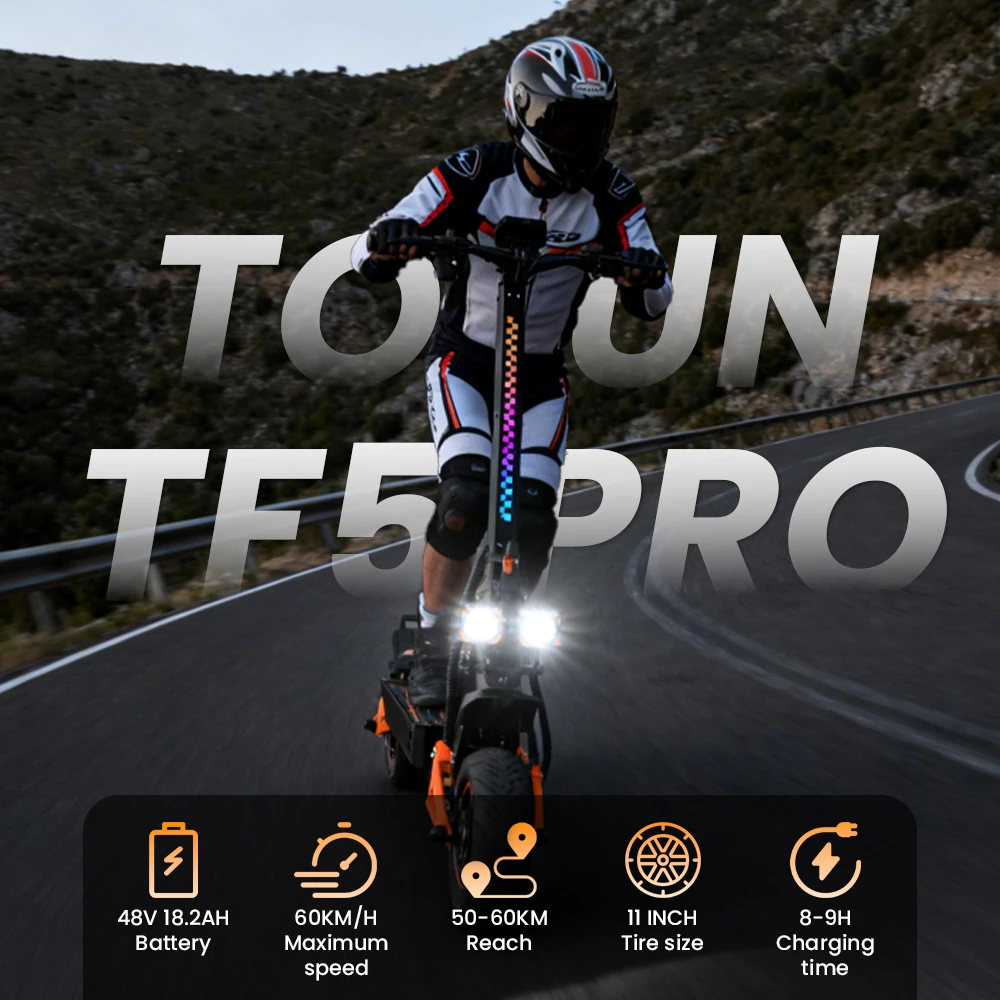 4 modalità di velocità regolabili offrono agli adulti prestazioni ottimali in ambienti urbani e fuoristradaLo schermo LCD intuitivo dello scooter elettrico fuoristrada visualizza dati in tempo reale come velocità, livello della batteria e modalità di guida, tenendoti informato e sicuroGrado di impermeabilità IPX4, grado di impermeabilità della batteria integrata IP65TF5 PRO Master è uno scooter elettrico per adulti dotato di due motori da 1200 W che forniscono una potenza eccezionaleIl sistema di assorbimento degli urti idraulico anteriore e posteriore assorbe facilmente vibrazioni e urti e la capacità di peso massima è fino a 150 kg, così puoi goderti un’esperienza di guida fluida e stabile su tutti i tipi di superficiLo scooter elettrico TF5 PRO per adulti è dotato di ampi pneumatici fuoristrada da 11 pollici, che ti consentono di conquistare qualsiasi terreno con facilità.Batteria da 48 V 18,2 Ah, lo scooter elettrico per adulti TF5 PRO offre una portata impressionante fino a 60 km con una singola carica, ideale per viaggi lunghi senza preoccuparsi dell’autonomia.Dischi freno da 140 mm per una distanza di frenata più sicuraSistema di illuminazione a tutto tondo Illumina la strada davanti al buioDoppie porte di ricarica Risparmia efficacemente tempo di ricarica